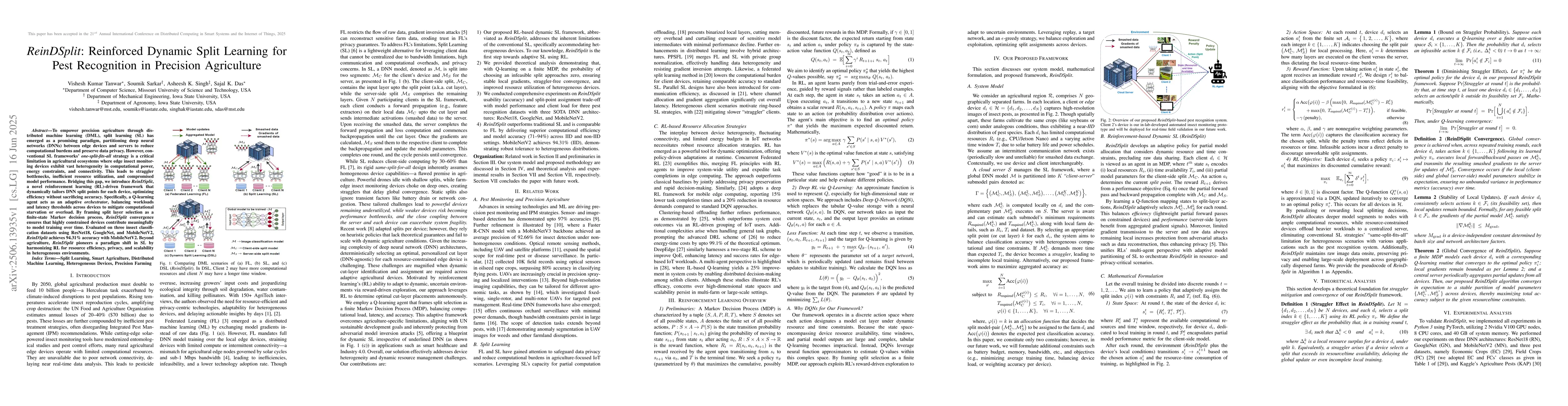 To empower precision agriculture through distributed machine learning (DML), split learning (SL) has emerged as a promising paradigm, partitioning deep neural networks (DNNs) between edge devices and servers to reduce computational burdens and preserve data privacy. However, conventional SL frameworks' one-split-fits-all strategy is a critical limitation in agricultural ecosystems where edge insect monitoring devices exhibit vast heterogeneity in computational power, energy constraints, and connectivity. This leads to straggler bottlenecks, inefficient resource utilization, and compromised model performance. Bridging this gap, we introduce ReinDSplit, a novel reinforcement learning (RL)-driven framework that dynamically tailors DNN split points for each device, optimizing efficiency without sacrificing accuracy. Specifically, a Q-learning agent acts as an adaptive orchestrator, balancing workloads and latency thresholds across devices to mitigate computational starvation or overload. By framing split layer selection as a finite-state Markov decision process, ReinDSplit convergence ensures that highly constrained devices contribute meaningfully to model training over time. Evaluated on three insect classification datasets using ResNet18, GoogleNet, and MobileNetV2, ReinDSplit achieves 94.31% accuracy with MobileNetV2. Beyond agriculture, ReinDSplit pioneers a paradigm shift in SL by harmonizing RL for resource efficiency, privacy, and scalability in heterogeneous environments.