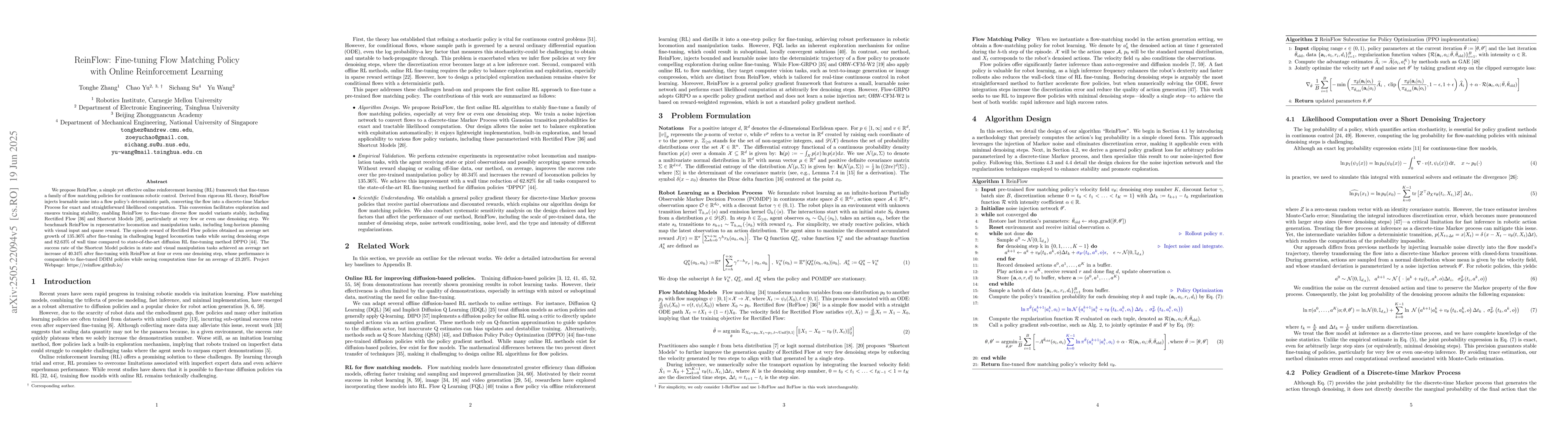 ReinFlow is an online reinforcement learning framework that fine-tunes flow matching policies for continuous robotic control, achieving significant performance gains with minimal denoising steps.