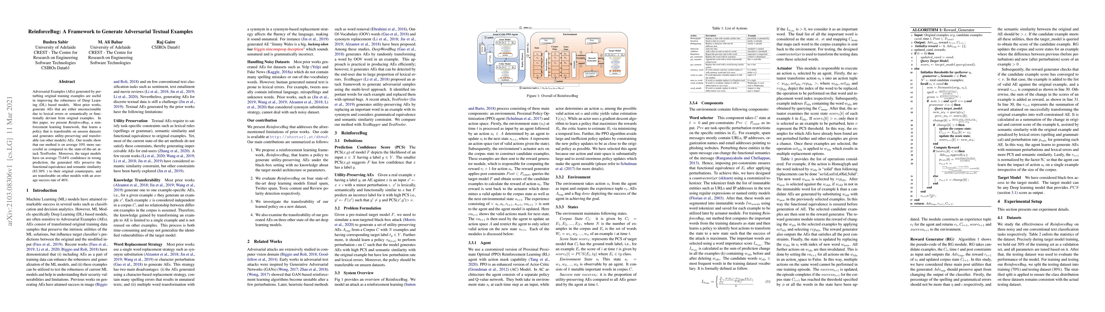 ReinforceBug is a reinforcement learning framework designed to generate adversarial textual examples that improve the robustness of Deep Learning models. It produces utility-preserving and transferable adversarial examples, outperforming the state-of-the-art attack method TextFooler by 10% on average.