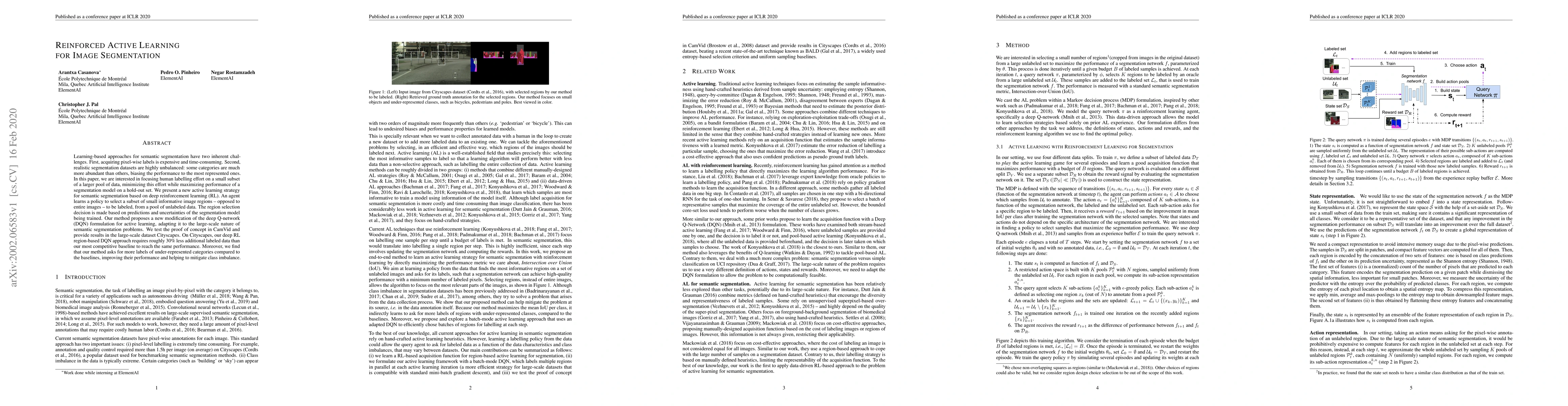 Learning-based approaches for semantic segmentation have two inherent challenges. First, acquiring pixel-wise labels is expensive and time-consuming. Second, realistic segmentation datasets are highly unbalanced: some categories are much more abundant than others, biasing the performance to the most represented ones. In this paper, we are interested in focusing human labelling effort on a small subset of a larger pool of data, minimizing this effort while maximizing performance of a segmentation model on a hold-out set. We present a new active learning strategy for semantic segmentation based on deep reinforcement learning (RL). An agent learns a policy to select a subset of small informative image regions -- opposed to entire images -- to be labeled, from a pool of unlabeled data. The region selection decision is made based on predictions and uncertainties of the segmentation model being trained. Our method proposes a new modification of the deep Q-network (DQN) formulation for active learning, adapting it to the large-scale nature of semantic segmentation problems. We test the proof of concept in CamVid and provide results in the large-scale dataset Cityscapes. On Cityscapes, our deep RL region-based DQN approach requires roughly 30% less additional labeled data than our most competitive baseline to reach the same performance. Moreover, we find that our method asks for more labels of under-represented categories compared to the baselines, improving their performance and helping to mitigate class imbalance.