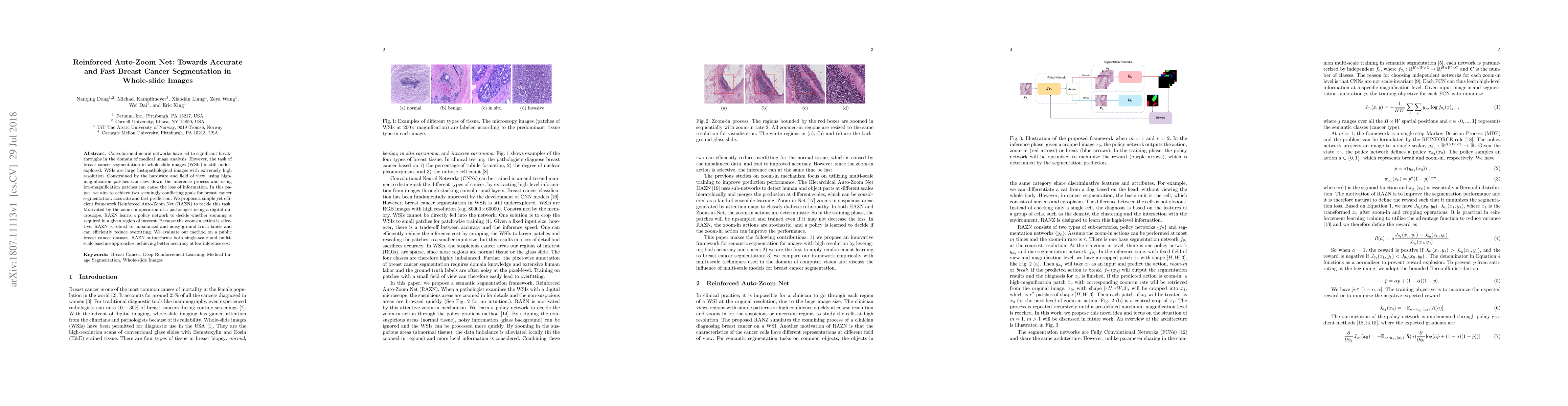 The paper proposes Reinforced Auto-Zoom Net (RAZN), a framework for accurate and fast breast cancer segmentation in whole-slide images, addressing the trade-off between high resolution and computational efficiency. RAZN uses a policy network to selectively zoom in on regions of interest, achieving high accuracy while minimizing inference time.