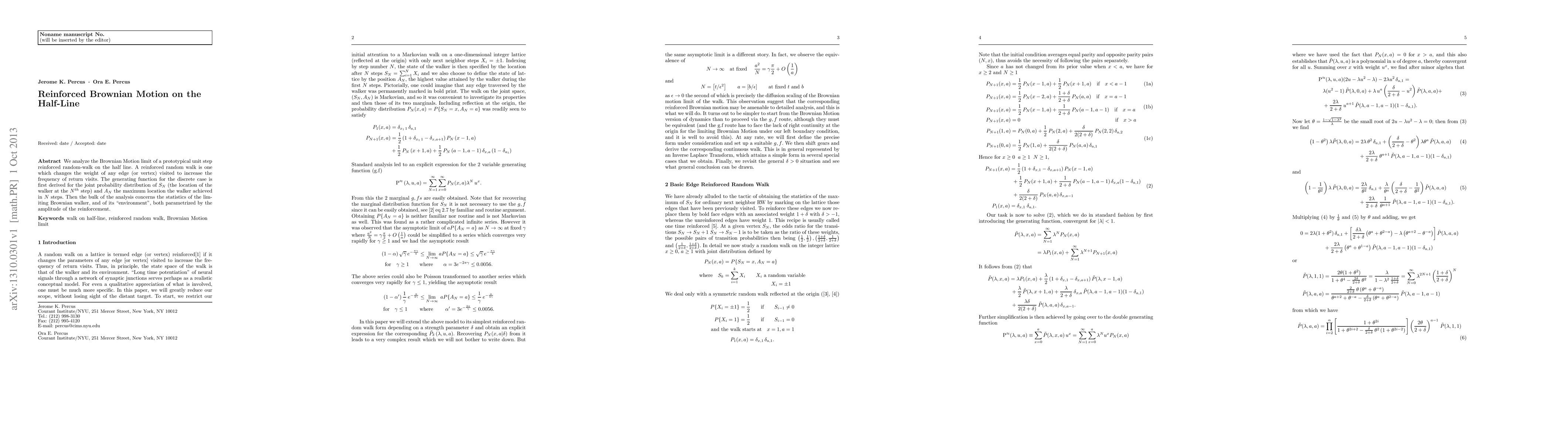 We analyze the Brownian Motion limit of a prototypical unit step reinforced random-walk on the half line. A reinforced random walk is one which changes the weight of any edge (or vertex) visited to increase the frequency of return visits. The generating function for the discrete case is first derived for the joint probability distribution of $S_N$ (the location of the walker at the $N$^{th}$ step) and $A_N$ the maximum location the walker achieved in $N$ steps. Then the bulk of the analysis concerns the statistics of the limiting Brownian walker, and of its "environment", both parametrized by the amplitude of the reinforcement.