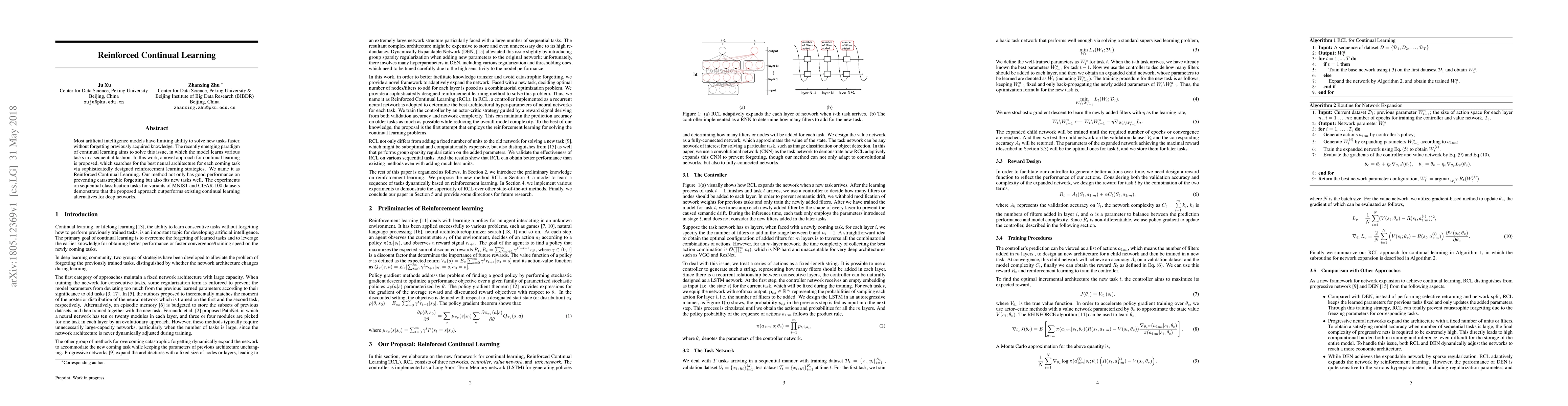 This paper proposes Reinforced Continual Learning, a novel approach that uses reinforcement learning to find the optimal neural architecture for new tasks, effectively preventing catastrophic forgetting and outperforming existing methods in continual learning on MNIST and CIFAR-100 datasets.
