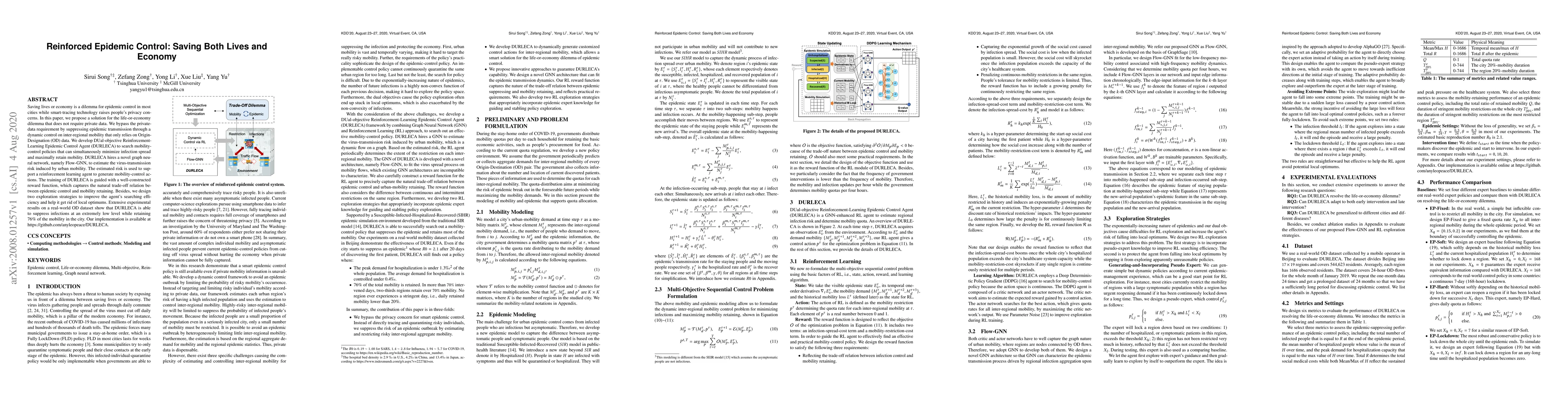 Saving lives or economy is a dilemma for epidemic control in most cities while smart-tracing technology raises people's privacy concerns. In this paper, we propose a solution for the life-or-economy dilemma that does not require private data. We bypass the private-data requirement by suppressing epidemic transmission through a dynamic control on inter-regional mobility that only relies on Origin-Designation (OD) data. We develop DUal-objective Reinforcement-Learning Epidemic Control Agent (DURLECA) to search mobility-control policies that can simultaneously minimize infection spread and maximally retain mobility. DURLECA hires a novel graph neural network, namely Flow-GNN, to estimate the virus-transmission risk induced by urban mobility. The estimated risk is used to support a reinforcement learning agent to generate mobility-control actions. The training of DURLECA is guided with a well-constructed reward function, which captures the natural trade-off relation between epidemic control and mobility retaining. Besides, we design two exploration strategies to improve the agent's searching efficiency and help it get rid of local optimums. Extensive experimental results on a real-world OD dataset show that DURLECA is able to suppress infections at an extremely low level while retaining 76\% of the mobility in the city. Our implementation is available at https://github.com/anyleopeace/DURLECA/.