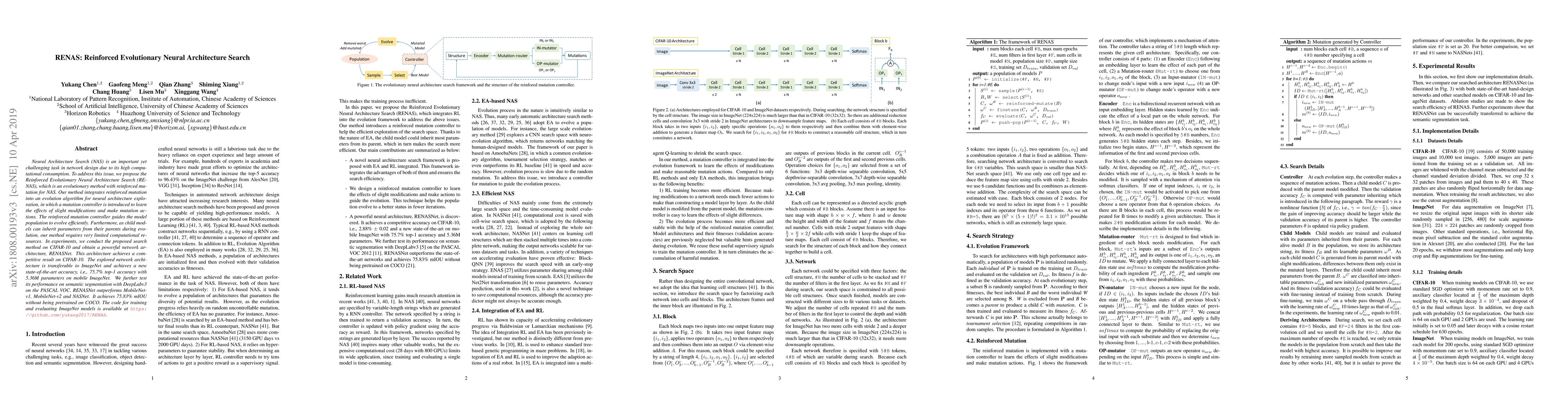 The paper proposes Reinforced Evolutionary Neural Architecture Search (RE-NAS), an efficient evolutionary method for neural architecture exploration that uses reinforced mutation to guide the evolution process, achieving competitive results on CIFAR-10 and state-of-the-art performance on ImageNet. The method also demonstrates superior performance in semantic segmentation on PASCAL VOC.