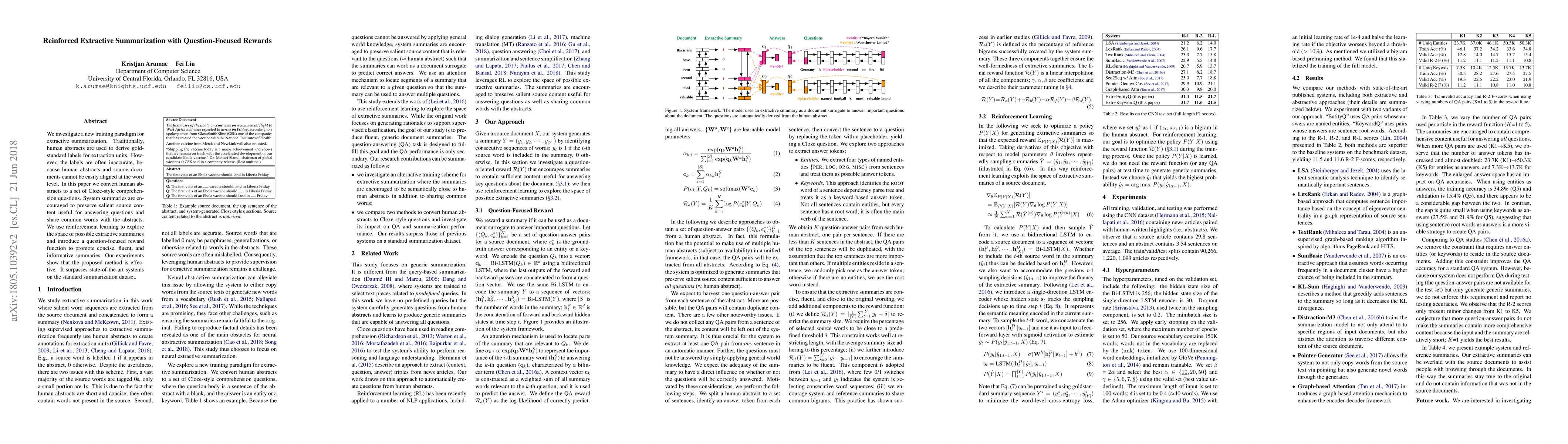 This paper proposes a novel training paradigm for extractive summarization using reinforcement learning and question-focused rewards, converting human abstracts into Cloze-style questions to guide the system. The method outperforms existing state-of-the-art systems on standard datasets by generating more concise, fluent, and informative summaries.