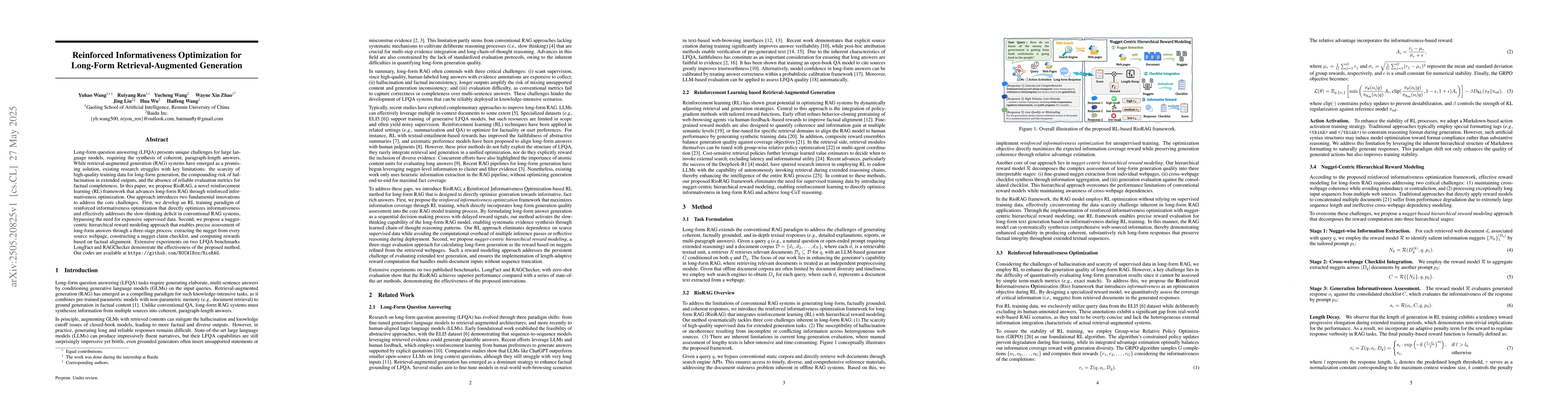 This paper proposes RioRAG, a reinforcement learning framework that optimizes informativeness for long-form question answering systems, addressing challenges of hallucination and factual completeness.