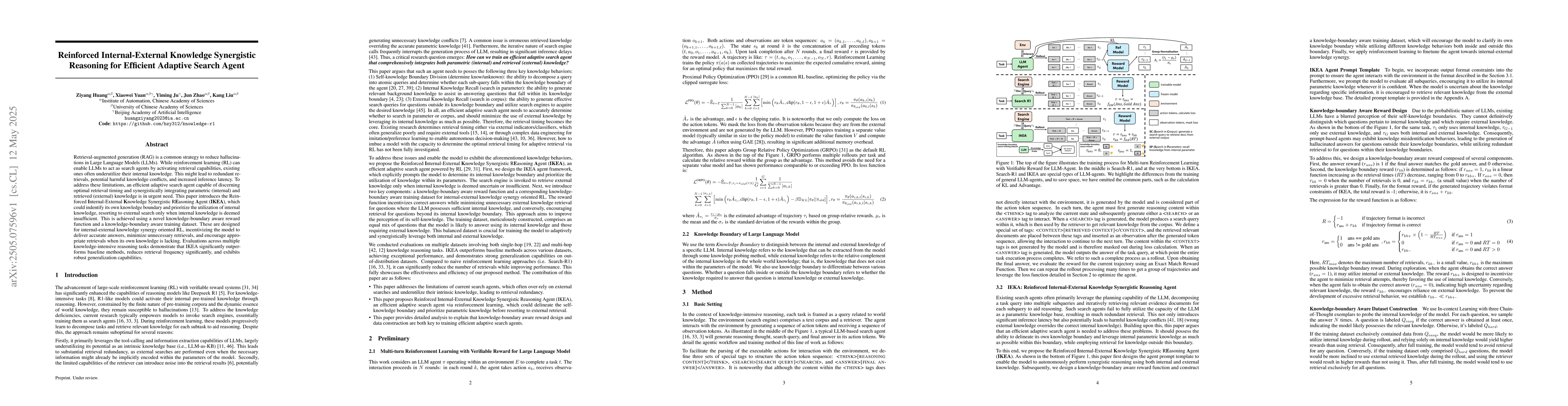 The paper proposes the Reinforced Internal-External Knowledge Synergistic Reasoning Agent (IKEA), utilizing a knowledge-boundary aware reward function and training dataset to optimize retrieval timing and knowledge integration.