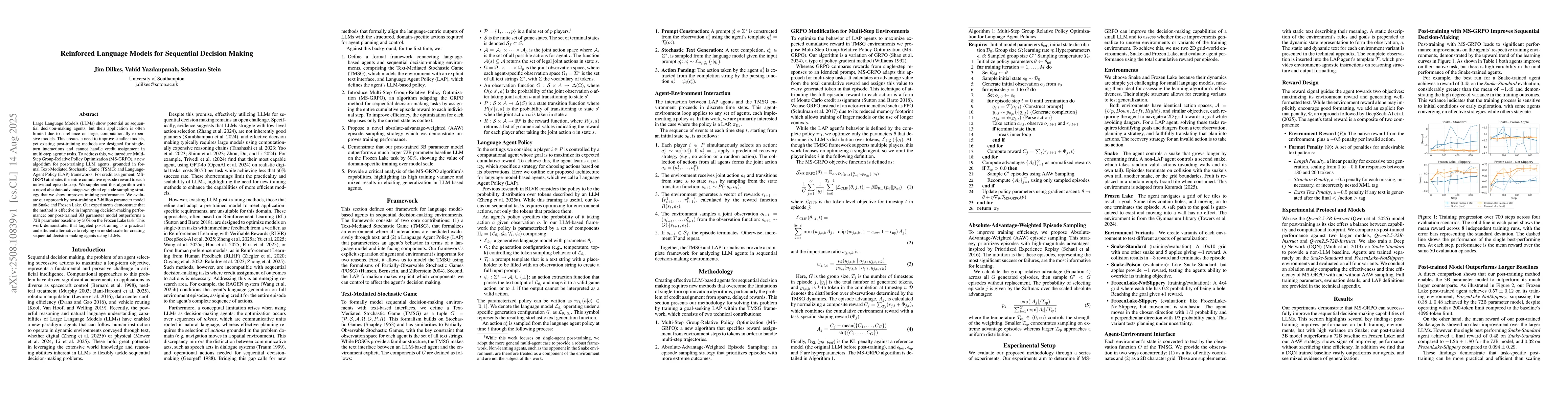 Large Language Models (LLMs) show potential as sequential decision-making agents, but their application is often limited due to a reliance on large, computationally expensive models. This creates a need to improve smaller models, yet existing post-training methods are designed for single-turn interactions and cannot handle credit assignment in multi-step agentic tasks. To address this, we introduce Multi-Step Group-Relative Policy Optimization (MS-GRPO), a new algorithm for post-training LLM agents, grounded in formal Text-Mediated Stochastic Game (TSMG) and Language-Agent Policy (LAP) frameworks. For credit assignment, MS-GRPO attributes the entire cumulative episode reward to each individual episode step. We supplement this algorithm with a novel absolute-advantage-weighted episode sampling strategy that we show improves training performance. We evaluate our approach by post-training a 3-billion parameter model on Snake and Frozen Lake. Our experiments demonstrate that the method is effective in improving decision-making performance: our post-trained 3B parameter model outperforms a 72B parameter baseline by 50% on the Frozen Lake task. This work demonstrates that targeted post-training is a practical and efficient alternative to relying on model scale for creating sequential decision-making agents using LLMs.