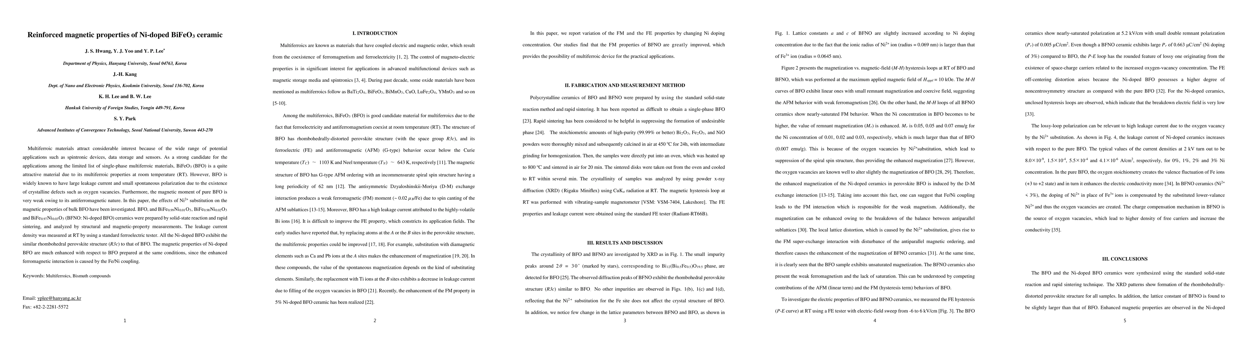 BFO and Ni-doped BFO ceramics were synthesized using solid-state reaction and rapid sintering. Structural and magnetic-property measurements were conducted to analyze the samples.