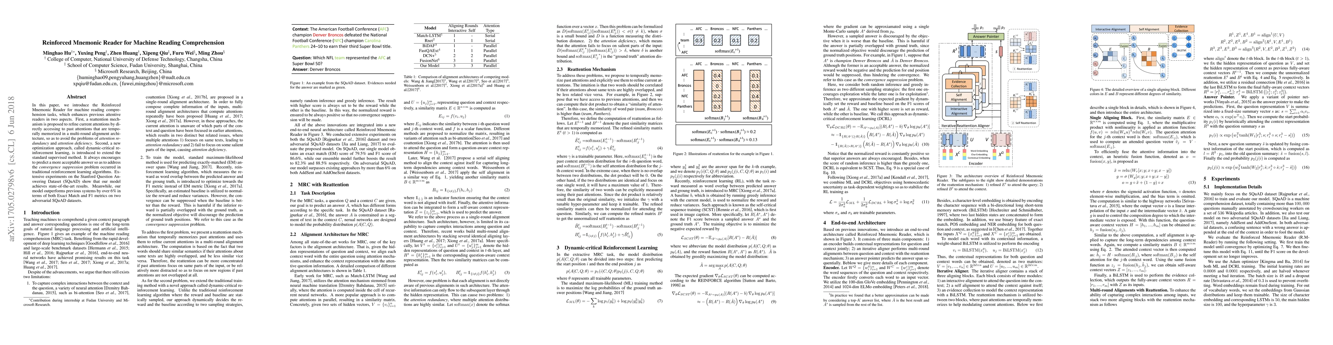The paper introduces the Reinforced Mnemonic Reader, an enhanced attention reader for machine reading comprehension tasks, which incorporates a reattention mechanism and dynamic-critical reinforcement learning.