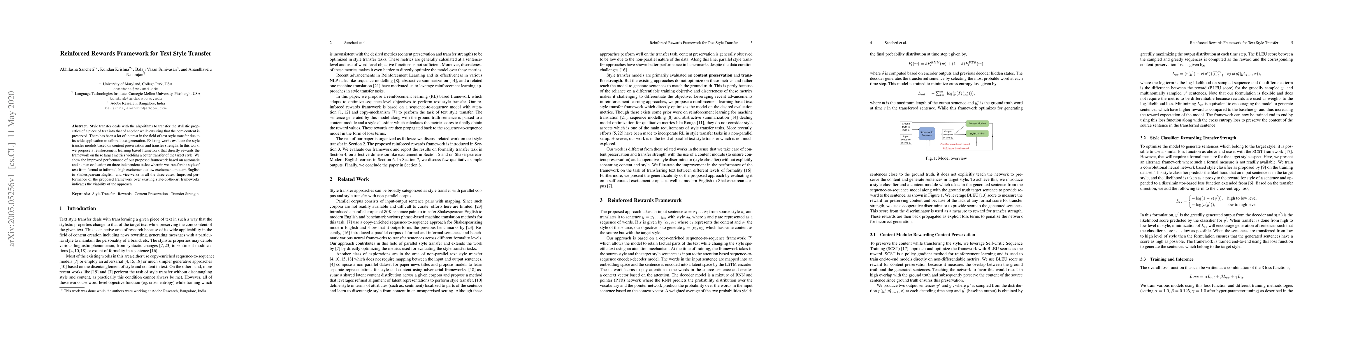 This paper proposes a reinforcement learning-based framework for text style transfer that directly rewards the model based on content preservation and style transfer strength, leading to better stylistic transformations. The framework shows improved performance over existing methods in tasks like formal to informal style transfer, as demonstrated through both automatic and human evaluations.