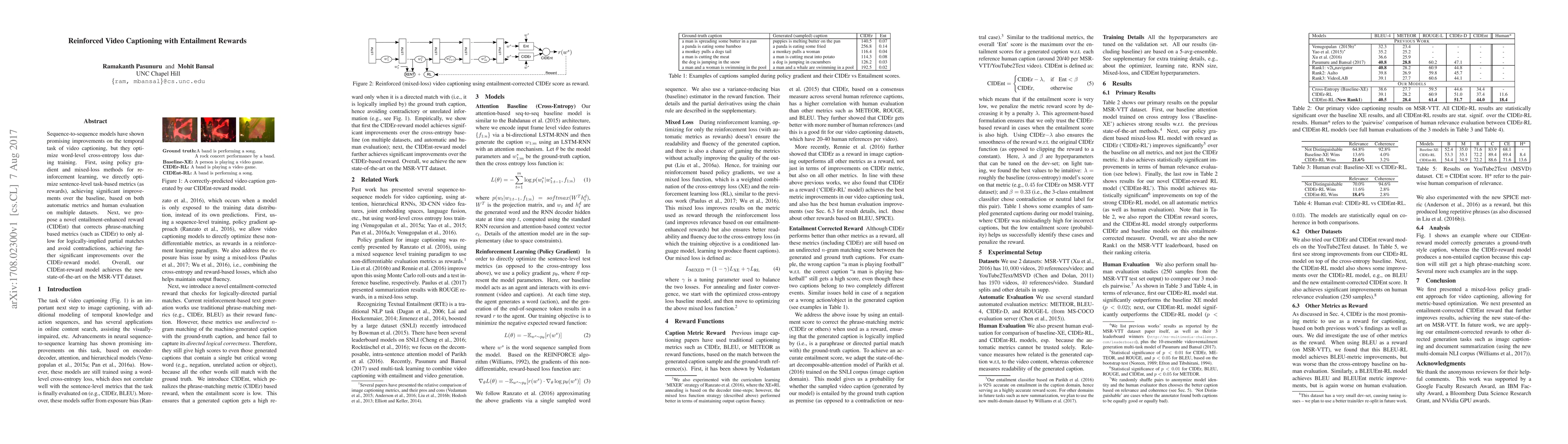 Sequence-to-sequence models have shown promising improvements on the temporal task of video captioning, but they optimize word-level cross-entropy loss during training. First, using policy gradient and mixed-loss methods for reinforcement learning, we directly optimize sentence-level task-based metrics (as rewards), achieving significant improvements over the baseline, based on both automatic metrics and human evaluation on multiple datasets. Next, we propose a novel entailment-enhanced reward (CIDEnt) that corrects phrase-matching based metrics (such as CIDEr) to only allow for logically-implied partial matches and avoid contradictions, achieving further significant improvements over the CIDEr-reward model. Overall, our CIDEnt-reward model achieves the new state-of-the-art on the MSR-VTT dataset.