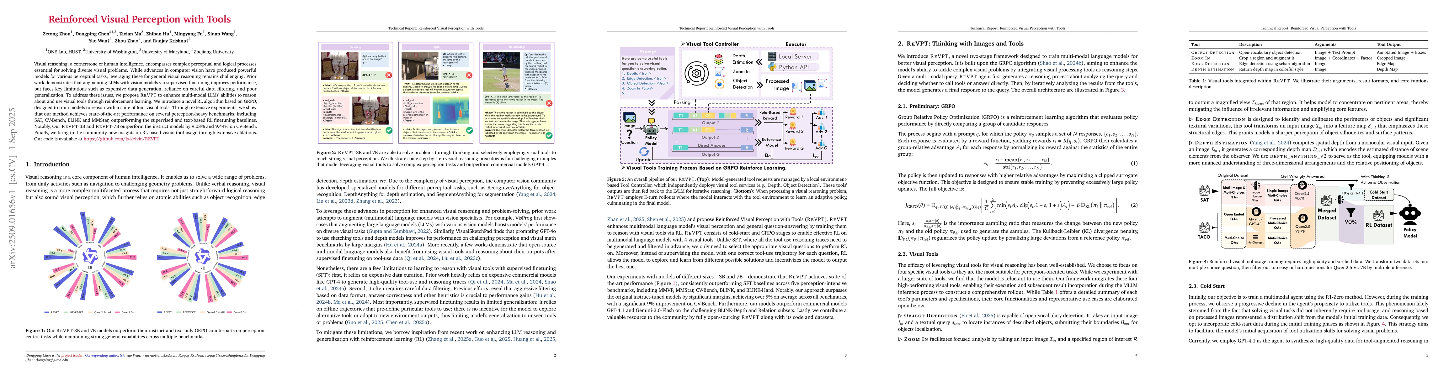 Visual reasoning, a cornerstone of human intelligence, encompasses complex perceptual and logical processes essential for solving diverse visual problems. While advances in computer vision have produced powerful models for various perceptual tasks, leveraging these for general visual reasoning remains challenging. Prior work demonstrates that augmenting LLMs with vision models via supervised finetuning improves performance, but faces key limitations such as expensive data generation, reliance on careful data filtering, and poor generalization. To address these issues, we propose ReVPT to enhance multi-modal LLMs' abilities to reason about and use visual tools through reinforcement learning. We introduce a novel RL algorithm based on GRPO, designed to train models to reason with a suite of four visual tools. Through extensive experiments, we show that our method achieves state-of-the-art performance on several perception-heavy benchmarks, including SAT, CV-Bench, BLINK and MMStar, significantly outperforming the supervised and text-based RL finetuning baselines. Notably, Our ReVPT-3B and ReVPT-7B outperform the instruct models by 9.03% and 9.44% on CV-Bench. Finally, we bring to the community new insights on RL-based visual tool-usage through extensive ablations. Our code is available at https://github.com/ls-kelvin/REVPT.