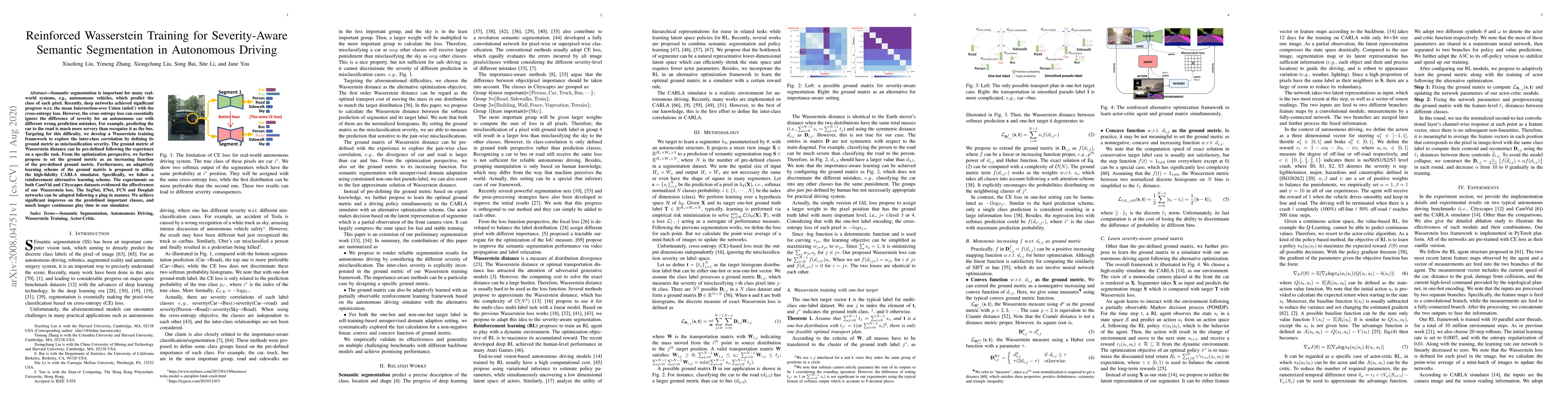 This paper proposes a reinforced Wasserstein training framework for severity-aware semantic segmentation in autonomous driving, aiming to improve the importance of misclassification severity. The method adapts the Wasserstein loss to prioritize critical misclassifications, achieving significant improvements in important classes and extended playtime in simulations.