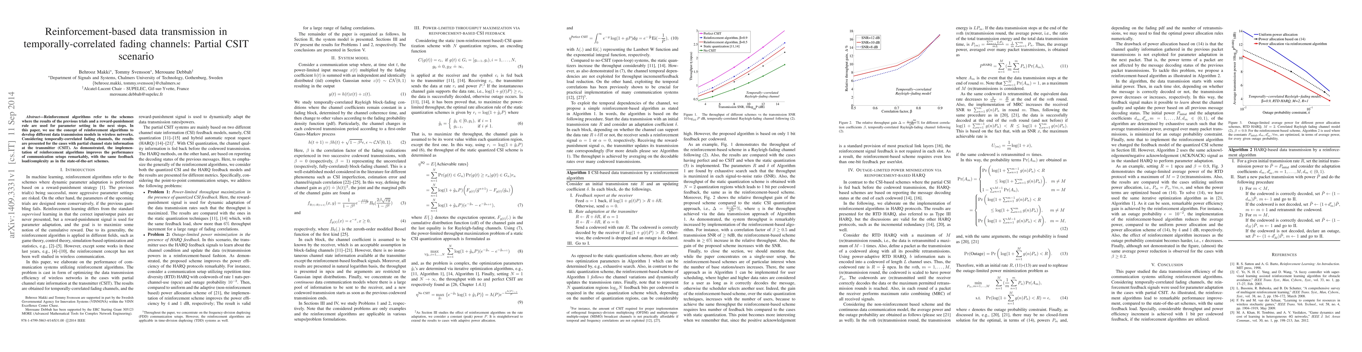 Reinforcement algorithms refer to the schemes where the results of the previous trials and a reward-punishment rule are used for parameter setting in the next steps. In this paper, we use the concept of reinforcement algorithms to develop different data transmission models in wireless networks. Considering temporally-correlated fading channels, the results are presented for the cases with partial channel state information at the transmitter (CSIT). As demonstrated, the implementation of reinforcement algorithms improves the performance of communication setups remarkably, with the same feedback load/complexity as in the state-of-the-art schemes.