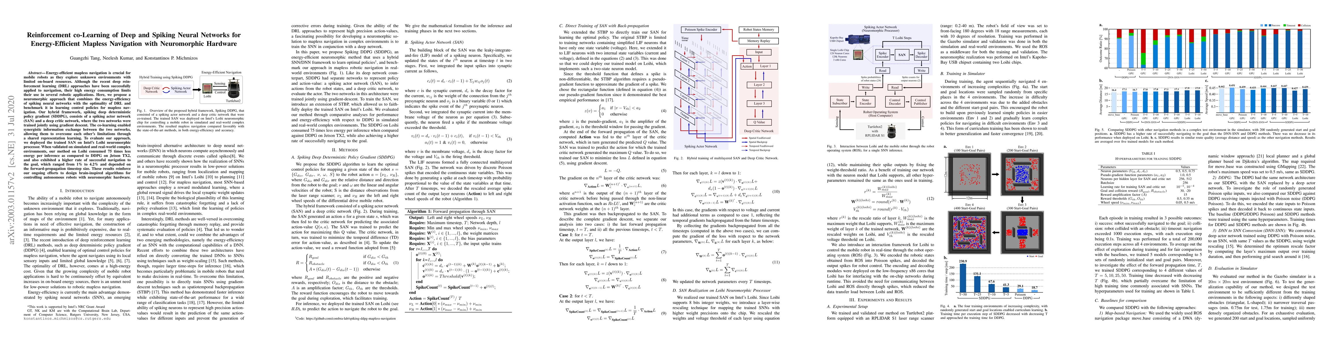 Energy-efficient mapless navigation is crucial for mobile robots as they explore unknown environments with limited on-board resources. Although the recent deep reinforcement learning (DRL) approaches have been successfully applied to navigation, their high energy consumption limits their use in several robotic applications. Here, we propose a neuromorphic approach that combines the energy-efficiency of spiking neural networks with the optimality of DRL and benchmark it in learning control policies for mapless navigation. Our hybrid framework, spiking deep deterministic policy gradient (SDDPG), consists of a spiking actor network (SAN) and a deep critic network, where the two networks were trained jointly using gradient descent. The co-learning enabled synergistic information exchange between the two networks, allowing them to overcome each other's limitations through a shared representation learning. To evaluate our approach, we deployed the trained SAN on Intel's Loihi neuromorphic processor. When validated on simulated and real-world complex environments, our method on Loihi consumed 75 times less energy per inference as compared to DDPG on Jetson TX2, and also exhibited a higher rate of successful navigation to the goal, which ranged from 1% to 4.2% and depended on the forward-propagation timestep size. These results reinforce our ongoing efforts to design brain-inspired algorithms for controlling autonomous robots with neuromorphic hardware.