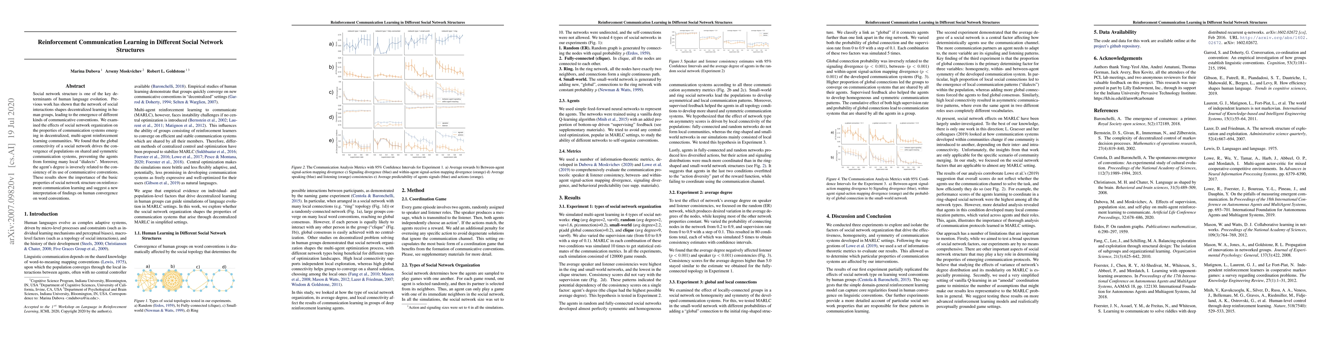 Social network structure is one of the key determinants of human language evolution. Previous work has shown that the network of social interactions shapes decentralized learning in human groups, leading to the emergence of different kinds of communicative conventions. We examined the effects of social network organization on the properties of communication systems emerging in decentralized, multi-agent reinforcement learning communities. We found that the global connectivity of a social network drives the convergence of populations on shared and symmetric communication systems, preventing the agents from forming many local "dialects". Moreover, the agent's degree is inversely related to the consistency of its use of communicative conventions. These results show the importance of the basic properties of social network structure on reinforcement communication learning and suggest a new interpretation of findings on human convergence on word conventions.