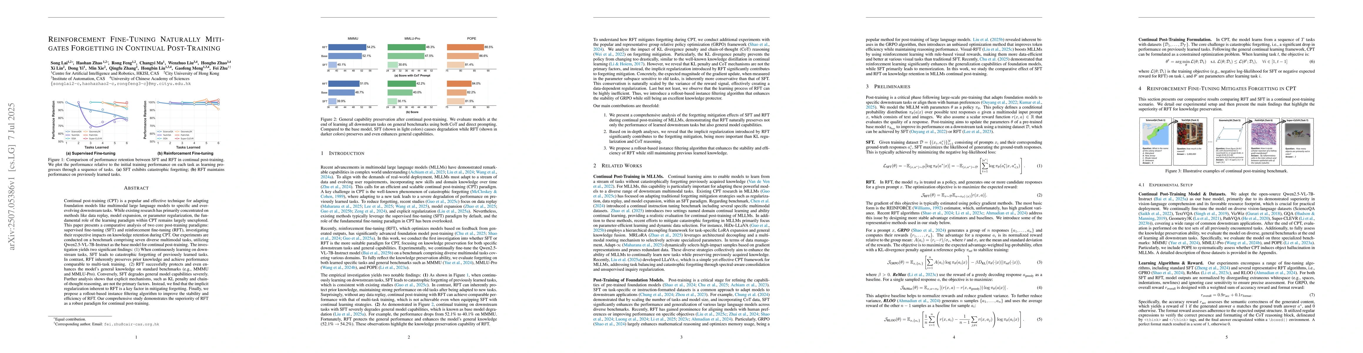 Continual post-training (CPT) is a popular and effective technique for adapting foundation models like multimodal large language models to specific and ever-evolving downstream tasks. While existing research has primarily concentrated on methods like data replay, model expansion, or parameter regularization, the fundamental role of the learning paradigm within CPT remains largely unexplored. This paper presents a comparative analysis of two core post-training paradigms: supervised fine-tuning (SFT) and reinforcement fine-tuning (RFT), investigating their respective impacts on knowledge retention during CPT. Our experiments are conducted on a benchmark comprising seven diverse multimodal tasks, utilizing Qwen2.5-VL-7B-Instruct as the base model for continual post-training. The investigation yields two significant findings: (1) When continuously learning on downstream tasks, SFT leads to catastrophic forgetting of previously learned tasks. In contrast, RFT inherently preserves prior knowledge and achieve performance comparable to multi-task training. (2) RFT successfully protects and even enhances the model's general knowledge on standard benchmarks (e.g., MMMU and MMLU-Pro). Conversely, SFT degrades general model capabilities severely. Further analysis shows that explicit mechanisms, such as KL penalty and chain-of-thought reasoning, are not the primary factors. Instead, we find that the implicit regularization inherent to RFT is a key factor in mitigating forgetting. Finally, we propose a rollout-based instance filtering algorithm to improve the stability and efficiency of RFT. Our comprehensive study demonstrates the superiority of RFT as a robust paradigm for continual post-training.