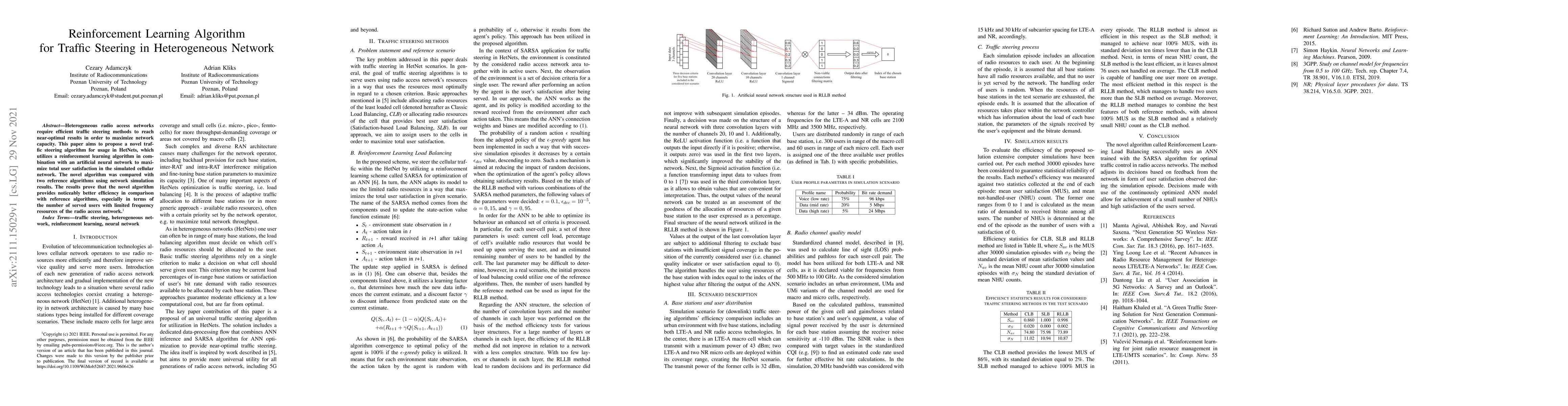 The use of SARSA with an artificial neural network model for traffic steering is novel and different from existing research