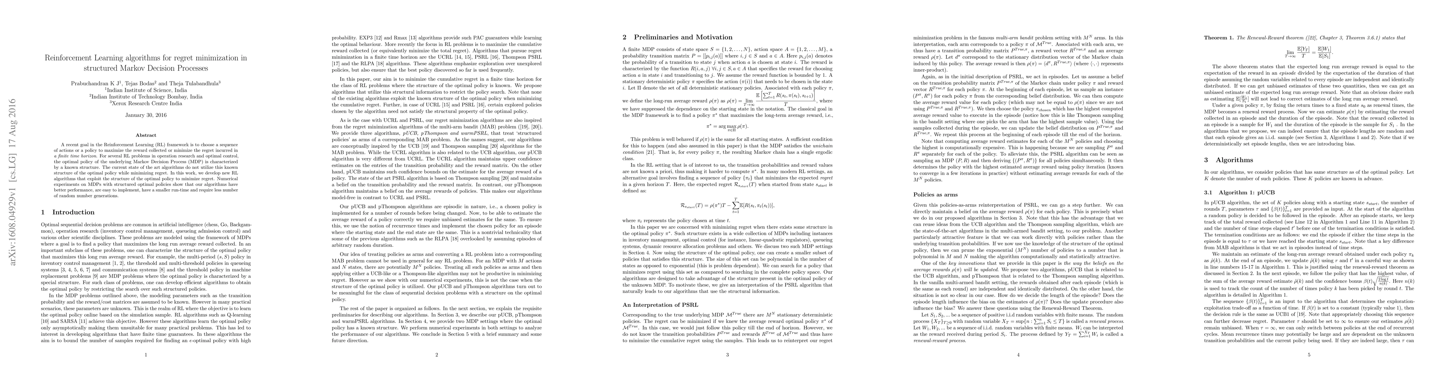 This paper introduces novel Reinforcement Learning algorithms designed to minimize regret in structured Markov Decision Processes (MDPs). These algorithms leverage the known structure of the optimal policy, resulting in improved performance, ease of implementation, reduced runtime, and fewer random number generations compared to existing methods.