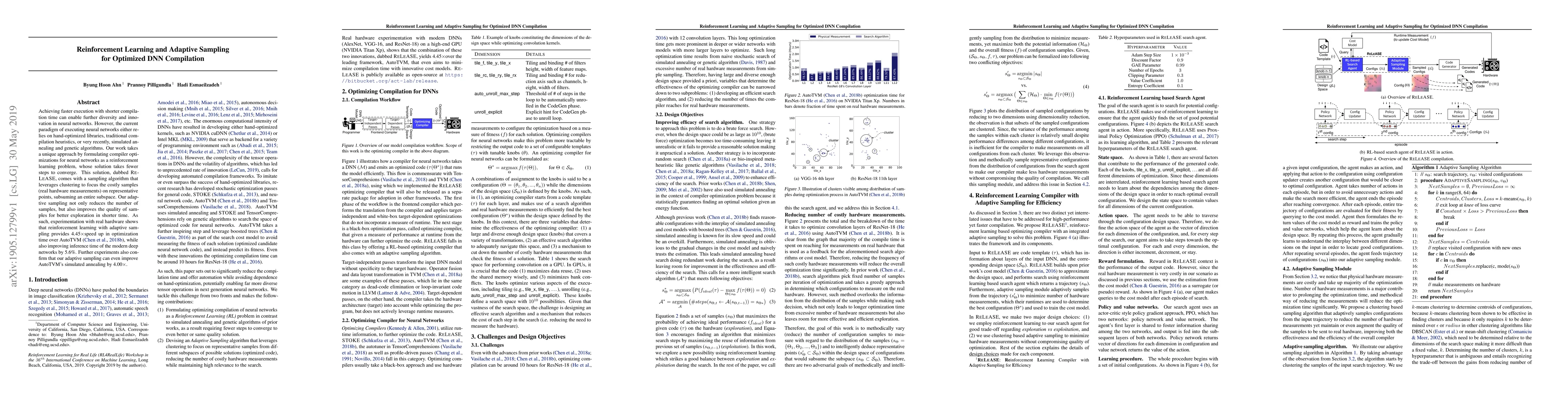 Achieving faster execution with shorter compilation time can enable further diversity and innovation in neural networks. However, the current paradigm of executing neural networks either relies on hand-optimized libraries, traditional compilation heuristics, or very recently, simulated annealing and genetic algorithms. Our work takes a unique approach by formulating compiler optimizations for neural networks as a reinforcement learning problem, whose solution takes fewer steps to converge. This solution, dubbed ReLeASE, comes with a sampling algorithm that leverages clustering to focus the costly samples (real hardware measurements) on representative points, subsuming an entire subspace. Our adaptive sampling not only reduces the number of samples, but also improves the quality of samples for better exploration in shorter time. As such, experimentation with real hardware shows that reinforcement learning with adaptive sampling provides 4.45x speed up in optimization time over AutoTVM, while also improving inference time of the modern deep networks by 5.6%. Further experiments also confirm that our adaptive sampling can even improve AutoTVM's simulated annealing by 4.00x.