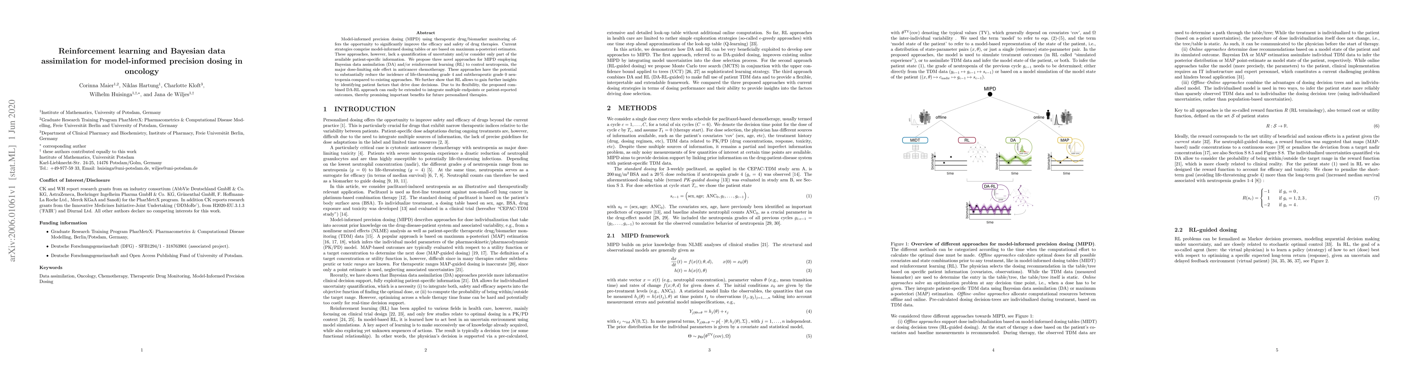 This paper proposes novel model-informed precision dosing methods using Bayesian data assimilation and reinforcement learning to optimize drug dosing in oncology, aiming to reduce severe side effects and improve treatment efficacy. The combined approach offers flexibility to integrate multiple patient factors and outcomes, promising significant benefits for personalized therapies.