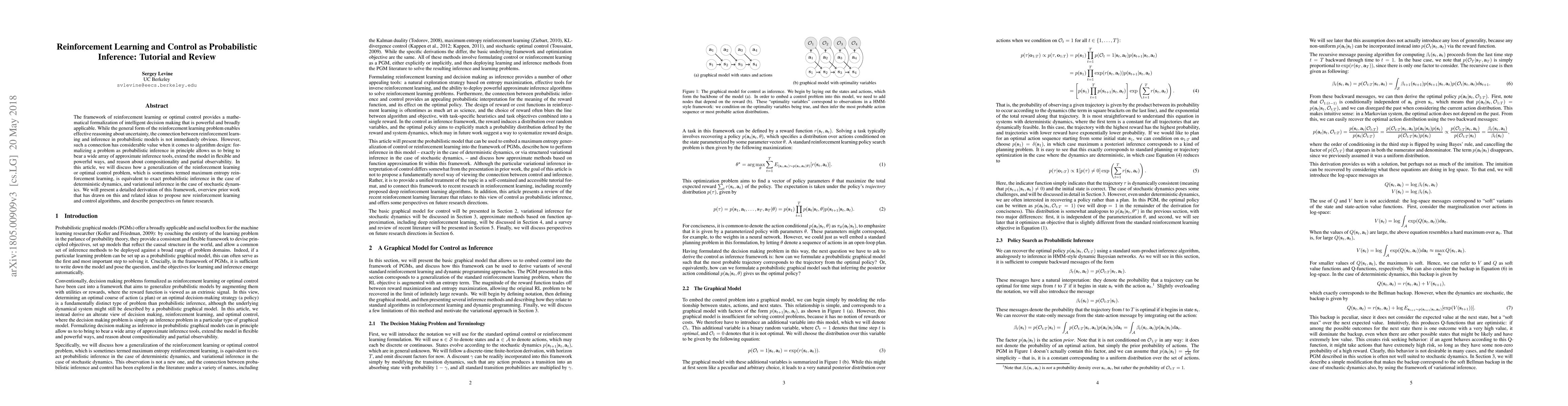This paper explores the connection between reinforcement learning and probabilistic inference, demonstrating that maximum entropy reinforcement learning can be framed as exact probabilistic inference under deterministic dynamics and variational inference under stochastic dynamics. It provides a detailed derivation and discusses how this framework can enhance algorithm design and future research directions.