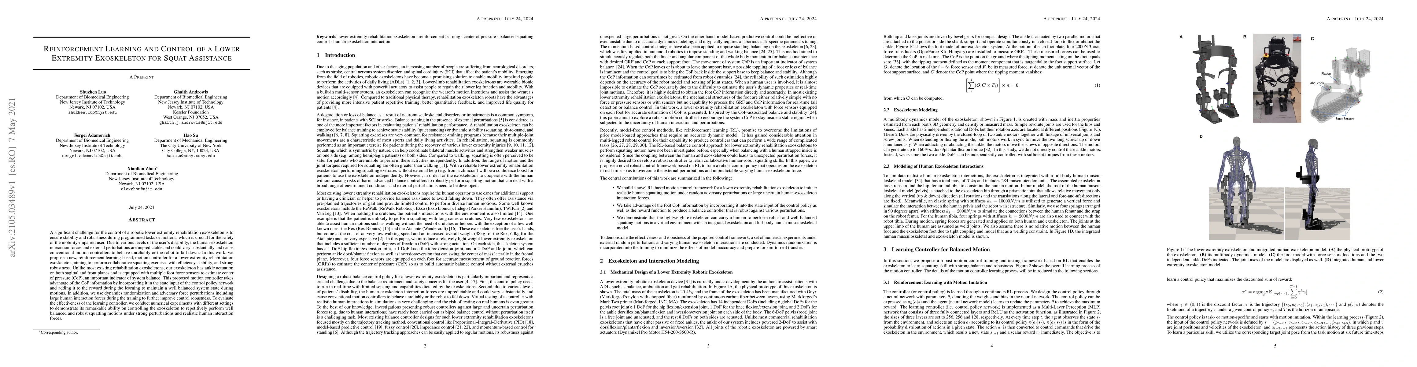 This research proposes a reinforcement learning-based motion controller for a lower extremity rehabilitation exoskeleton to assist in squat exercises, emphasizing stability and robustness. The controller leverages center of pressure data and incorporates adversarial training to enhance robustness against unpredictable human-exoskeleton interactions and external perturbations.