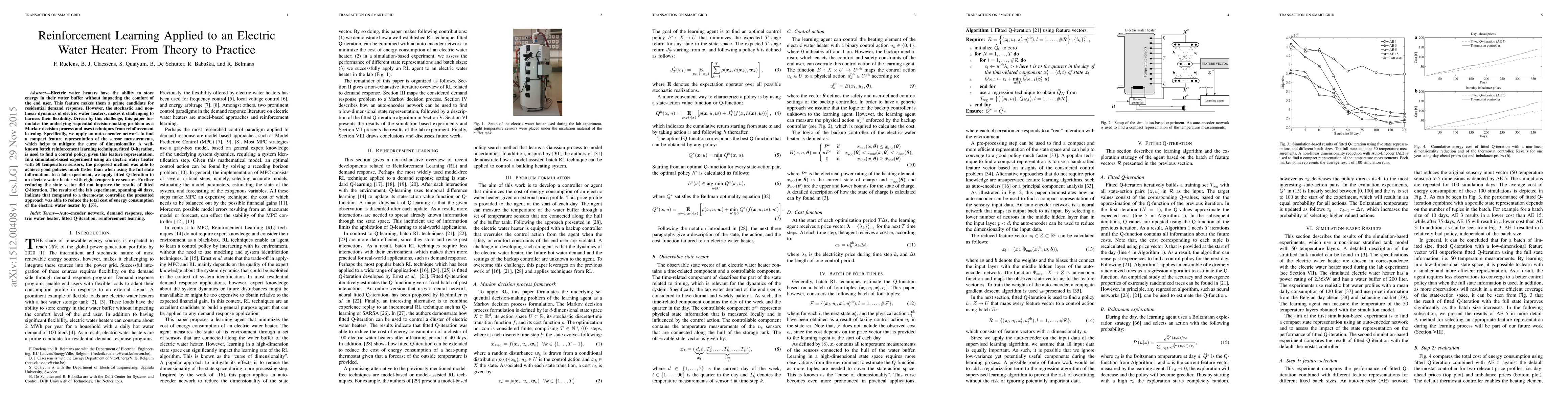 This paper explores using reinforcement learning to optimize the control of electric water heaters for residential demand response, employing fitted Q-iteration and an auto-encoder network to manage complex dynamics and reduce dimensionality. Experimental results show a 15% reduction in energy consumption costs compared to traditional thermostat control.