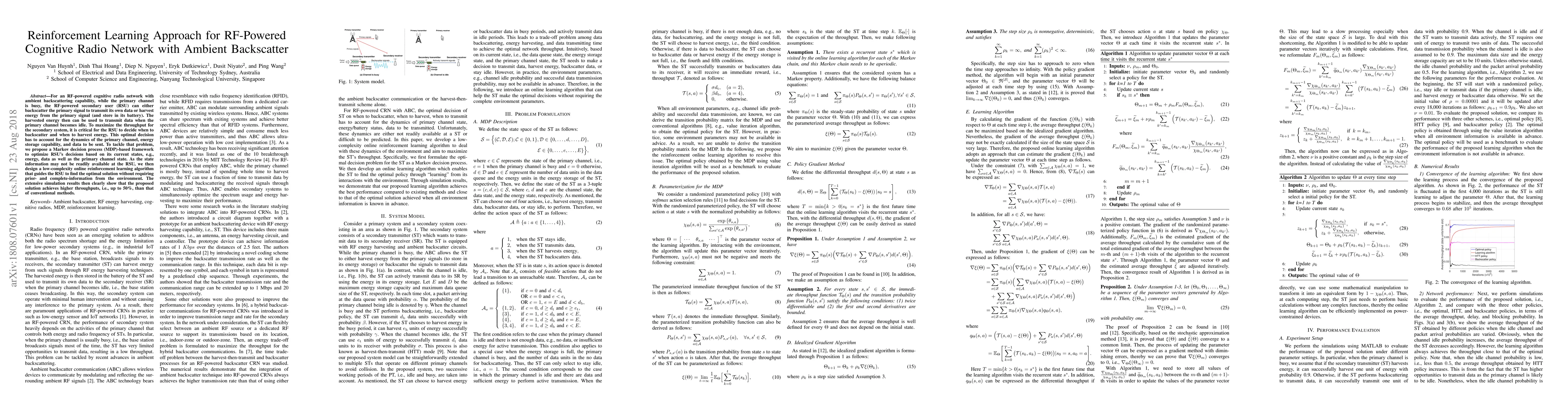 This paper proposes a reinforcement learning approach to optimize energy harvesting and backscattering decisions in RF-powered cognitive radio networks with ambient backscatter. The Markov decision process framework and online reinforcement learning algorithm enable the secondary user to maximize throughput without complete state information. Simulation results show a 50% improvement in throughput compared to conventional methods.