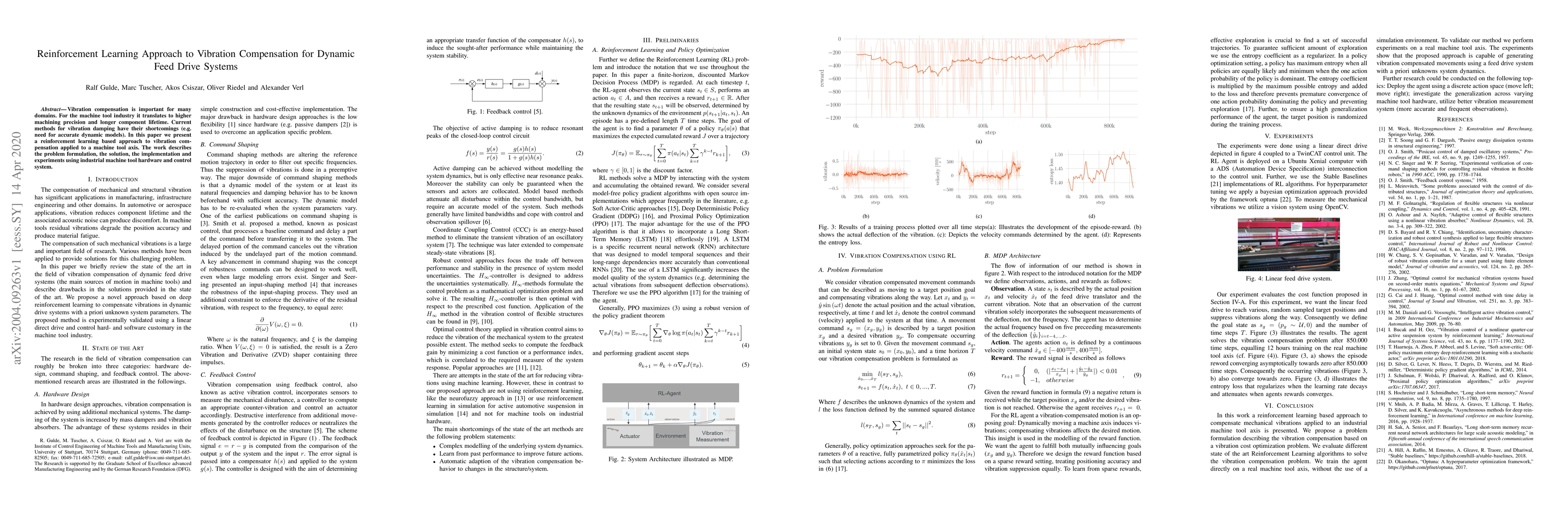 Vibration compensation is important for many domains. For the machine tool industry it translates to higher machining precision and longer component lifetime. Current methods for vibration damping have their shortcomings (e.g. need for accurate dynamic models). In this paper we present a reinforcement learning based approach to vibration compensation applied to a machine tool axis. The work describes the problem formulation, the solution, the implementation and experiments using industrial machine tool hardware and control system.