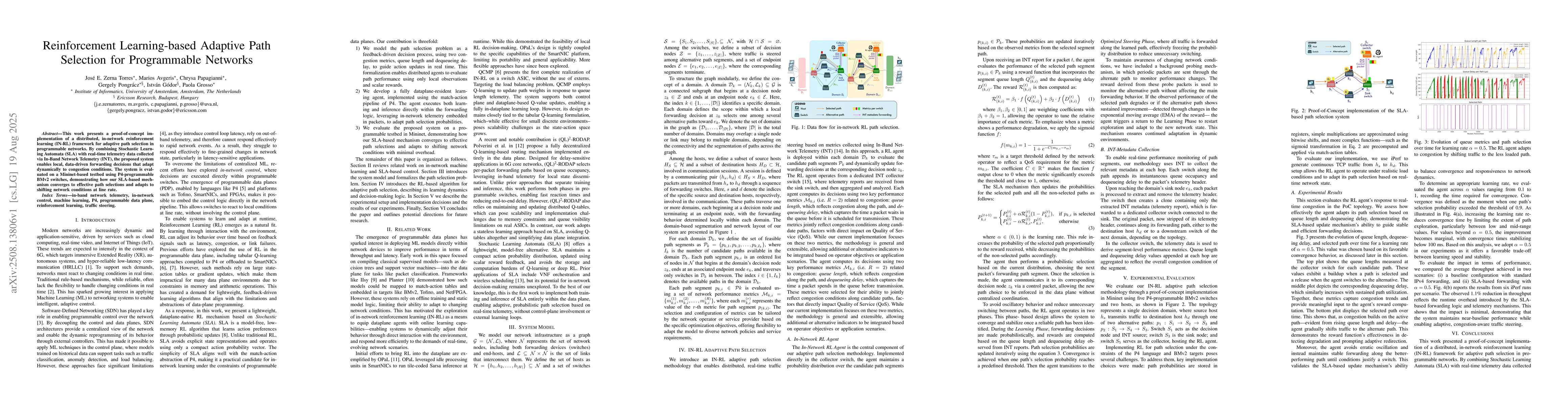 This work presents a proof-of-concept implementation of a distributed, in-network reinforcement learning (IN-RL) framework for adaptive path selection in programmable networks. By combining Stochastic Learning Automata (SLA) with real-time telemetry data collected via In-Band Network Telemetry (INT), the proposed system enables local, data-driven forwarding decisions that adapt dynamically to congestion conditions. The system is evaluated on a Mininet-based testbed using P4-programmable BMv2 switches, demonstrating how our SLA-based mechanism converges to effective path selections and adapts to shifting network conditions at line rate.