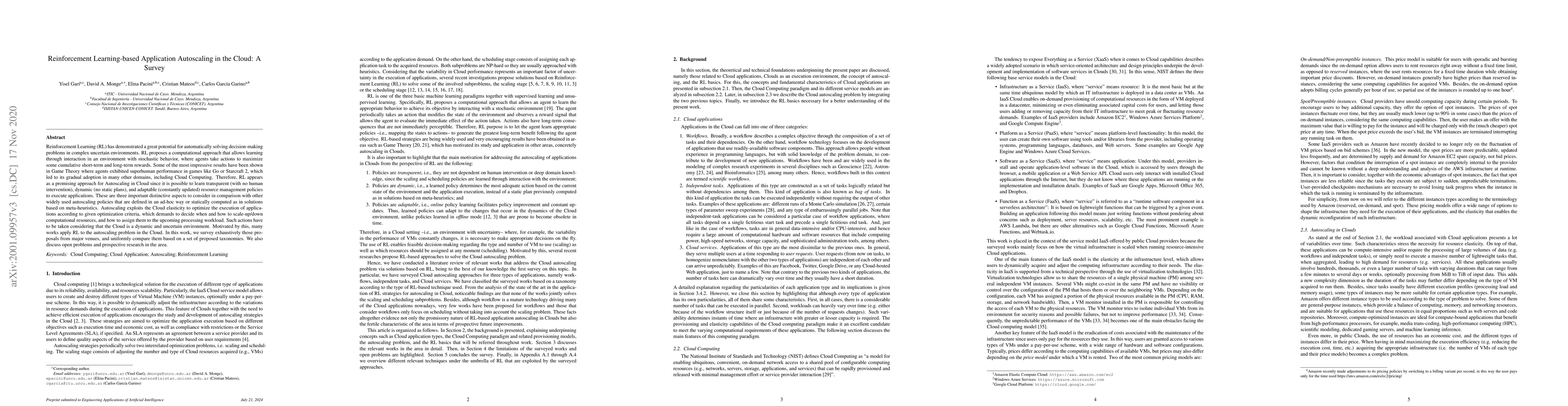 Reinforcement Learning (RL) has demonstrated a great potential for automatically solving decision-making problems in complex uncertain environments. RL proposes a computational approach that allows learning through interaction in an environment with stochastic behavior, where agents take actions to maximize some cumulative short-term and long-term rewards. Some of the most impressive results have been shown in Game Theory where agents exhibited superhuman performance in games like Go or Starcraft 2, which led to its gradual adoption in many other domains, including Cloud Computing. Therefore, RL appears as a promising approach for Autoscaling in Cloud since it is possible to learn transparent (with no human intervention), dynamic (no static plans), and adaptable (constantly updated) resource management policies to execute applications. These are three important distinctive aspects to consider in comparison with other widely used autoscaling policies that are defined in an ad-hoc way or statically computed as in solutions based on meta-heuristics. Autoscaling exploits the Cloud elasticity to optimize the execution of applications according to given optimization criteria, which demands to decide when and how to scale-up/down computational resources, and how to assign them to the upcoming processing workload. Such actions have to be taken considering that the Cloud is a dynamic and uncertain environment. Motivated by this, many works apply RL to the autoscaling problem in the Cloud. In this work, we survey exhaustively those proposals from major venues, and uniformly compare them based on a set of proposed taxonomies. We also discuss open problems and prospective research in the area.