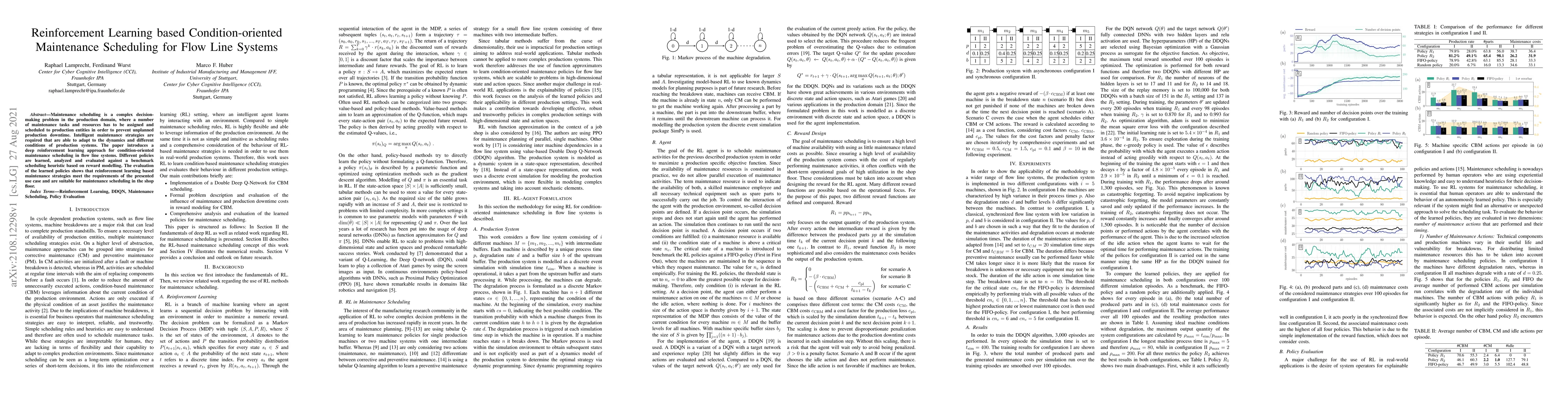 Maintenance scheduling is a complex decision-making problem in the production domain, where a number of maintenance tasks and resources has to be assigned and scheduled to production entities in order to prevent unplanned production downtime. Intelligent maintenance strategies are required that are able to adapt to the dynamics and different conditions of production systems. The paper introduces a deep reinforcement learning approach for condition-oriented maintenance scheduling in flow line systems. Different policies are learned, analyzed and evaluated against a benchmark scheduling heuristic based on reward modelling. The evaluation of the learned policies shows that reinforcement learning based maintenance strategies meet the requirements of the presented use case and are suitable for maintenance scheduling in the shop floor.
