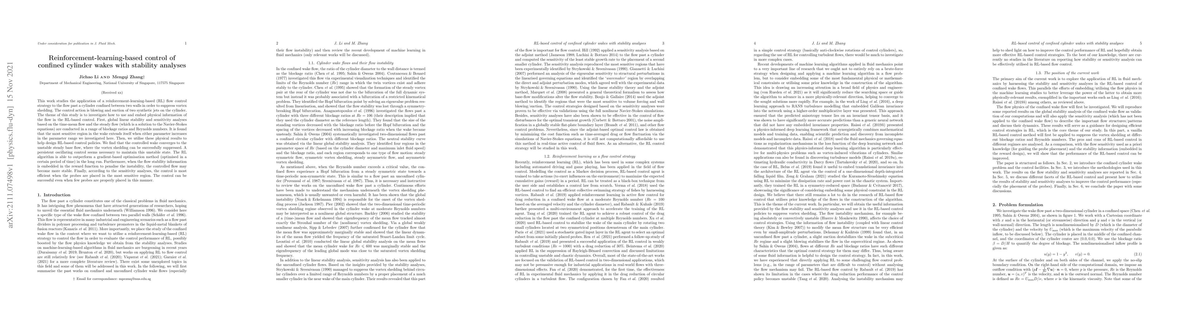 This work studies the application of a reinforcement-learning-based (RL) flow control strategy to the flow past a cylinder confined between two walls in order to suppress vortex shedding. The control action is blowing and suction of two synthetic jets on the cylinder. The theme of this study is to investigate how to use and embed physical information of the flow in the RL-based control. First, global linear stability and sensitivity analyses based on the time-mean flow and the steady flow (which is a solution to the Navier-Stokes equations) are conducted in a range of blockage ratios and Reynolds numbers. It is found that the most sensitive region in the wake extends itself when either parameter increases in the parameter range we investigated here. Then, we utilise these physical results to help design RL-based control policies. We find that the controlled wake converges to the unstable steady base flow, where the vortex shedding can be successfully suppressed. A persistent oscillating control seems necessary to maintain this unstable state. The RL algorithm is able to outperform a gradient-based optimisation method (optimised in a certain period of time) in the long run. Furthermore, when the flow stability information is embedded in the reward function to penalise the instability, the controlled flow may become more stable. Finally, according to the sensitivity analyses, the control is most efficient when the probes are placed in the most sensitive region. The control can be successful even when few probes are properly placed in this manner.