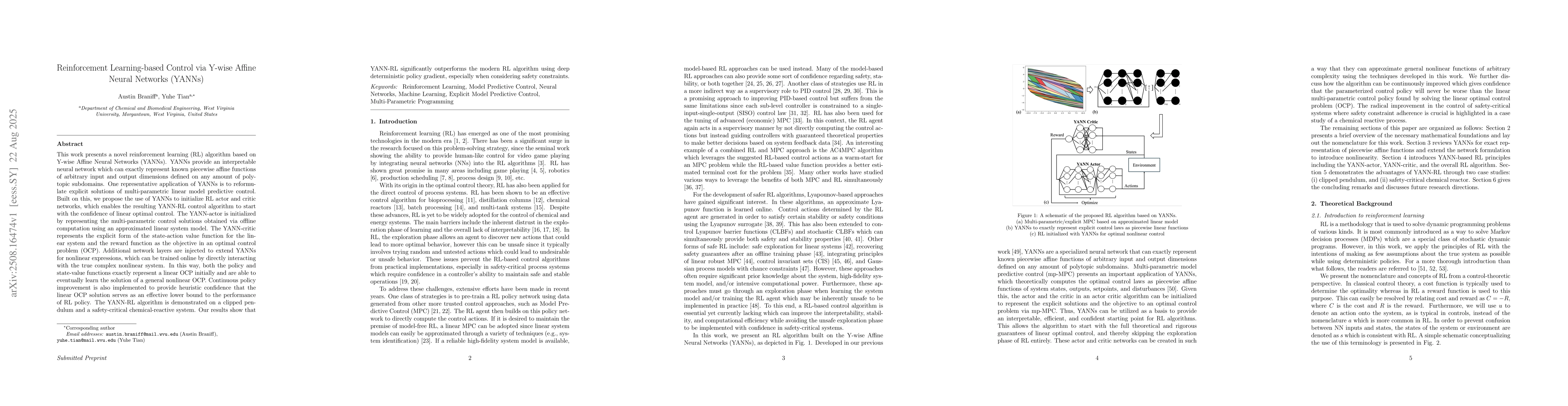 This work presents a novel reinforcement learning (RL) algorithm based on Y-wise Affine Neural Networks (YANNs). YANNs provide an interpretable neural network which can exactly represent known piecewise affine functions of arbitrary input and output dimensions defined on any amount of polytopic subdomains. One representative application of YANNs is to reformulate explicit solutions of multi-parametric linear model predictive control. Built on this, we propose the use of YANNs to initialize RL actor and critic networks, which enables the resulting YANN-RL control algorithm to start with the confidence of linear optimal control. The YANN-actor is initialized by representing the multi-parametric control solutions obtained via offline computation using an approximated linear system model. The YANN-critic represents the explicit form of the state-action value function for the linear system and the reward function as the objective in an optimal control problem (OCP). Additional network layers are injected to extend YANNs for nonlinear expressions, which can be trained online by directly interacting with the true complex nonlinear system. In this way, both the policy and state-value functions exactly represent a linear OCP initially and are able to eventually learn the solution of a general nonlinear OCP. Continuous policy improvement is also implemented to provide heuristic confidence that the linear OCP solution serves as an effective lower bound to the performance of RL policy. The YANN-RL algorithm is demonstrated on a clipped pendulum and a safety-critical chemical-reactive system. Our results show that YANN-RL significantly outperforms the modern RL algorithm using deep deterministic policy gradient, especially when considering safety constraints.