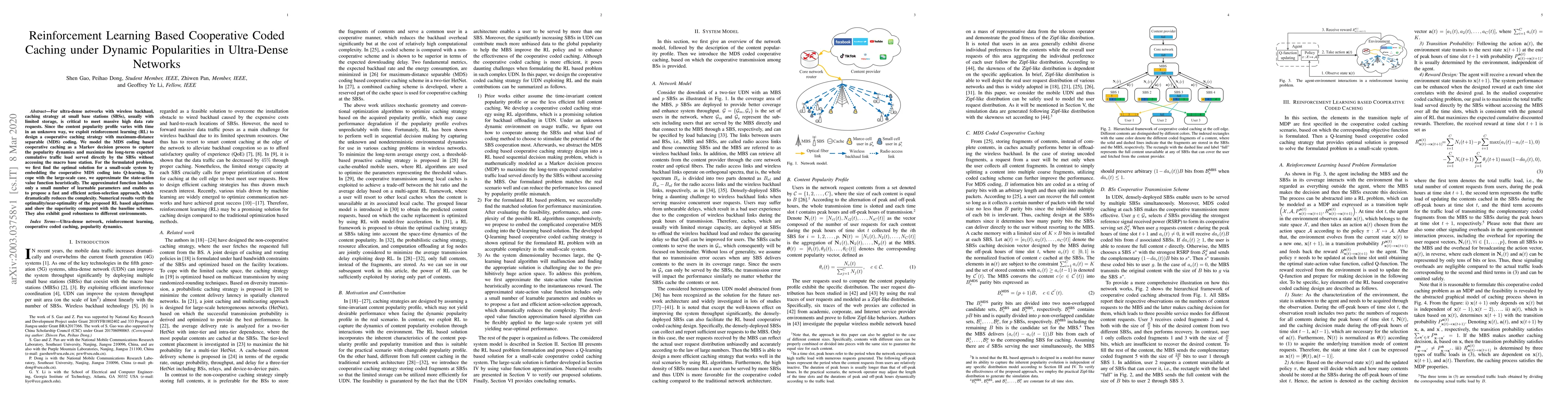 This paper proposes a reinforcement learning-based cooperative coded caching strategy for ultra-dense networks, utilizing maximum-distance separable coding to handle dynamic content popularity. The approach maximizes the long-term traffic load served directly by small base stations, demonstrating near-optimal performance and reduced complexity compared to baseline methods.
