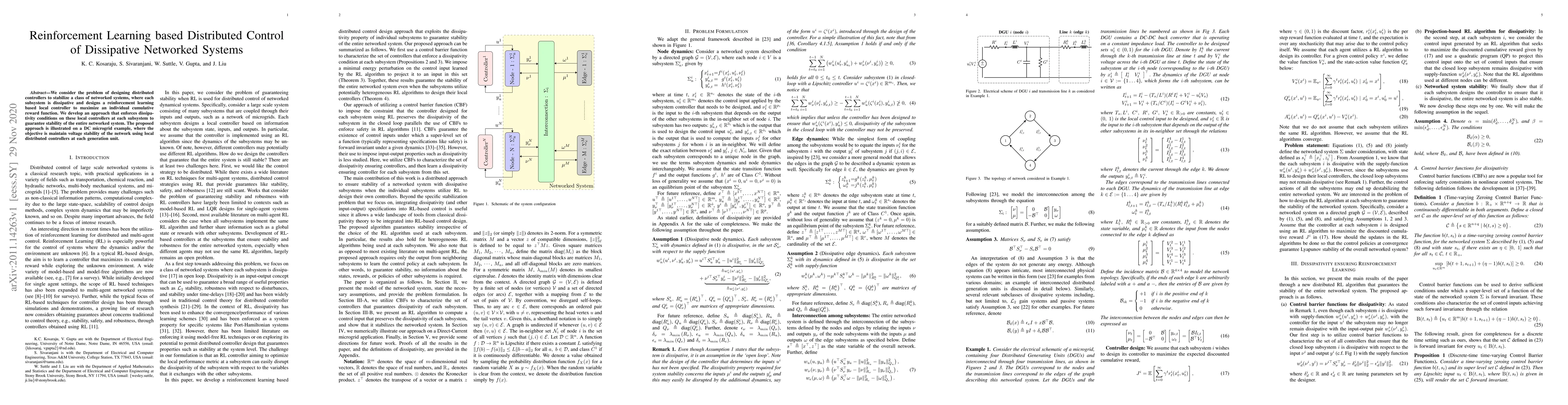 We consider the problem of designing distributed controllers to stabilize a class of networked systems, where each subsystem is dissipative and designs a reinforcement learning based local controller to maximize an individual cumulative reward function. We develop an approach that enforces dissipativity conditions on these local controllers at each subsystem to guarantee stability of the entire networked system. The proposed approach is illustrated on a DC microgrid example, where the objective is maintain voltage stability of the network using local distributed controllers at each generation unit.