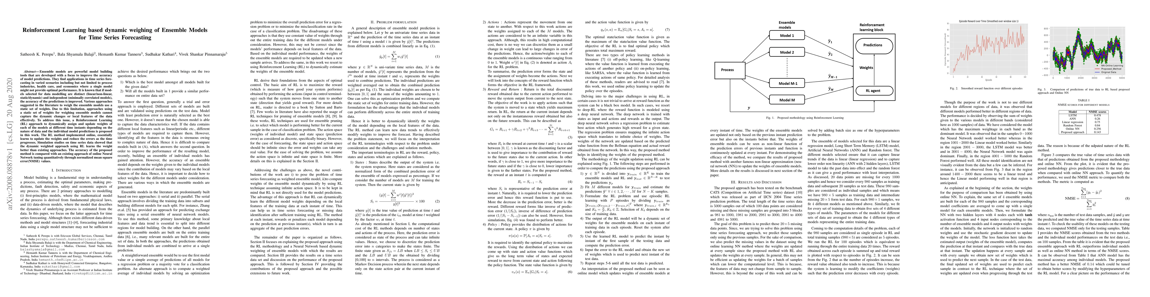 Ensemble models are powerful model building tools that are developed with a focus to improve the accuracy of model predictions. They find applications in time series forecasting in varied scenarios including but not limited to process industries, health care, and economics where a single model might not provide optimal performance. It is known that if models selected for data modelling are distinct (linear/non-linear, static/dynamic) and independent (minimally correlated models), the accuracy of the predictions is improved. Various approaches suggested in the literature to weigh the ensemble models use a static set of weights. Due to this limitation, approaches using a static set of weights for weighing ensemble models cannot capture the dynamic changes or local features of the data effectively. To address this issue, a Reinforcement Learning (RL) approach to dynamically assign and update weights of each of the models at different time instants depending on the nature of data and the individual model predictions is proposed in this work. The RL method implemented online, essentially learns to update the weights and reduce the errors as the time progresses. Simulation studies on time series data showed that the dynamic weighted approach using RL learns the weight better than existing approaches. The accuracy of the proposed method is compared with an existing approach of online Neural Network tuning quantitatively through normalized mean square error(NMSE) values.