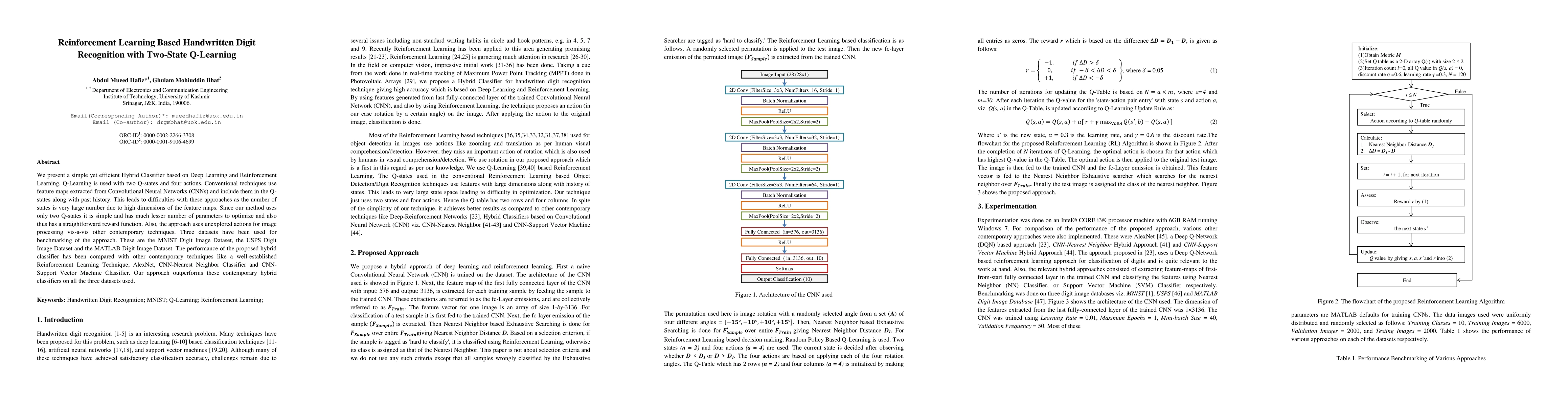 We present a simple yet efficient Hybrid Classifier based on Deep Learning and Reinforcement Learning. Q-Learning is used with two Q-states and four actions. Conventional techniques use feature maps extracted from Convolutional Neural Networks (CNNs) and include them in the Qstates along with past history. This leads to difficulties with these approaches as the number of states is very large number due to high dimensions of the feature maps. Since our method uses only two Q-states it is simple and has much lesser number of parameters to optimize and also thus has a straightforward reward function. Also, the approach uses unexplored actions for image processing vis-a-vis other contemporary techniques. Three datasets have been used for benchmarking of the approach. These are the MNIST Digit Image Dataset, the USPS Digit Image Dataset and the MATLAB Digit Image Dataset. The performance of the proposed hybrid classifier has been compared with other contemporary techniques like a well-established Reinforcement Learning Technique, AlexNet, CNN-Nearest Neighbor Classifier and CNNSupport Vector Machine Classifier. Our approach outperforms these contemporary hybrid classifiers on all the three datasets used.