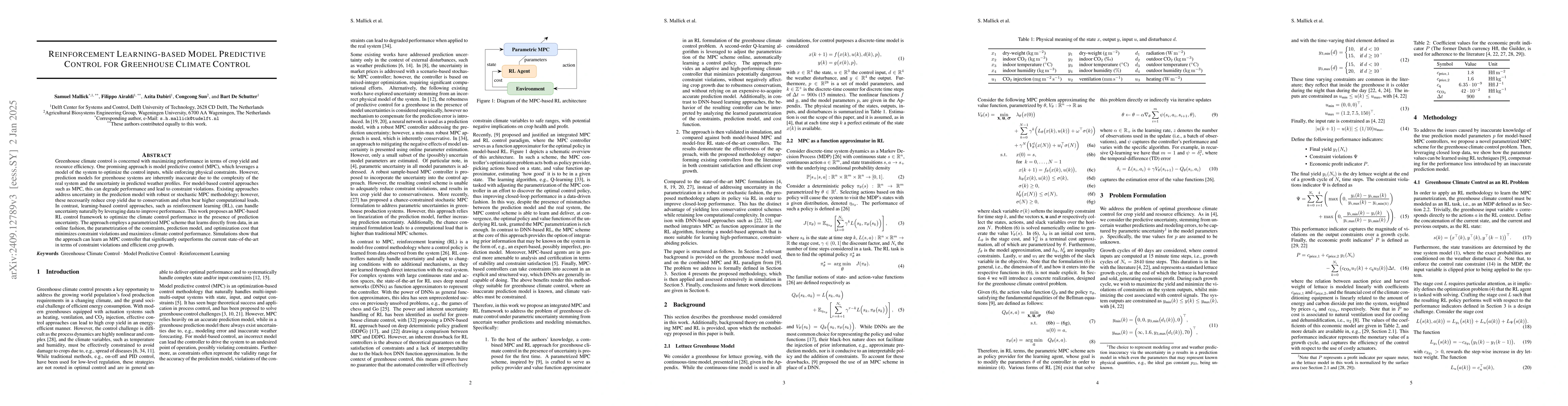 Greenhouse climate control is concerned with maximizing performance in terms of crop yield and resource efficiency. One promising approach is model predictive control (MPC), which leverages a model of the system to optimize the control inputs, while enforcing physical constraints. However, prediction models for greenhouse systems are inherently inaccurate due to the complexity of the real system and the uncertainty in predicted weather profiles. For model-based control approaches such as MPC, this can degrade performance and lead to constraint violations. Existing approaches address uncertainty in the prediction model with robust or stochastic MPC methodology; however, these necessarily reduce crop yield due to conservatism and often bear higher computational loads. In contrast, learning-based control approaches, such as reinforcement learning (RL), can handle uncertainty naturally by leveraging data to improve performance. This work proposes an MPC-based RL control framework to optimize the climate control performance in the presence of prediction uncertainty. The approach employs a parametrized MPC scheme that learns directly from data, in an online fashion, the parametrization of the constraints, prediction model, and optimization cost that minimizes constraint violations and maximizes climate control performance. Simulations show that the approach can learn an MPC controller that significantly outperforms the current state-of-the-art in terms of constraint violations and efficient crop growth.