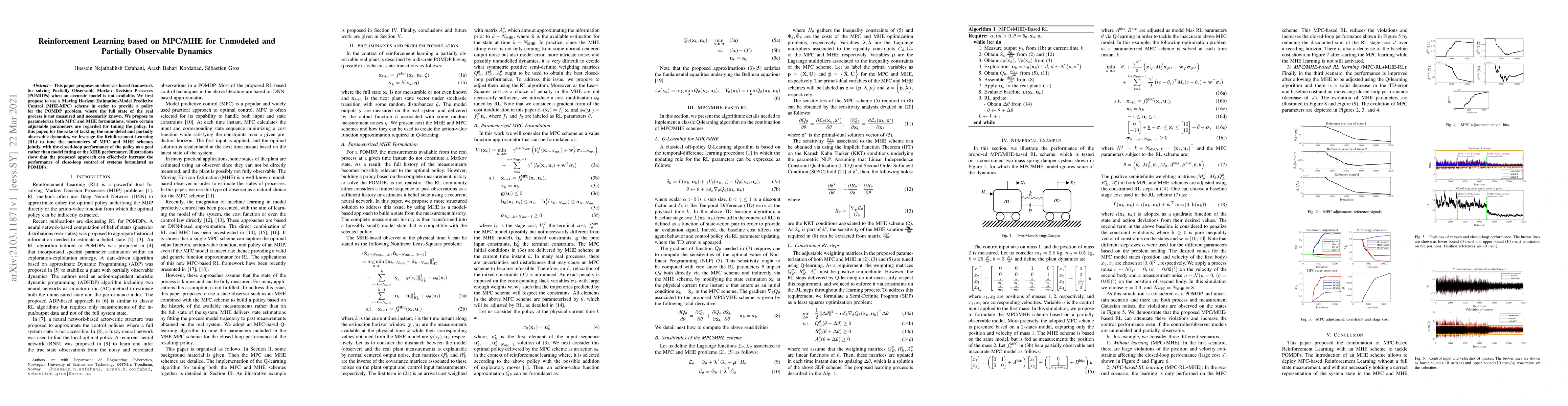 This paper proposes an observer-based framework for solving Partially Observable Markov Decision Processes (POMDPs) when an accurate model is not available. We first propose to use a Moving Horizon Estimation-Model Predictive Control (MHE-MPC) scheme in order to provide a policy for the POMDP problem, where the full state of the real process is not measured and necessarily known. We propose to parameterize both MPC and MHE formulations, where certain adjustable parameters are regarded for tuning the policy. In this paper, for the sake of tackling the unmodeled and partially observable dynamics, we leverage the Reinforcement Learning (RL) to tune the parameters of MPC and MHE schemes jointly, with the closed-loop performance of the policy as a goal rather than model fitting or the MHE performance. Illustrations show that the proposed approach can effectively increase the performance of close-loop control of systems formulated as POMDPs.