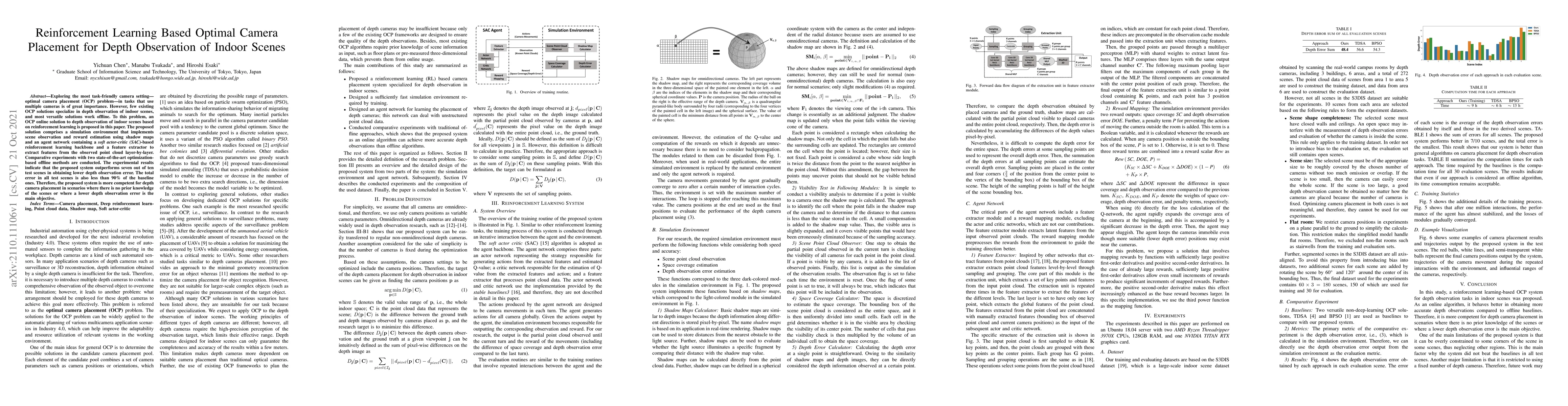 A novel reinforcement learning-based approach optimizes camera placement for depth observation in indoor scenes, outperforming existing offline methods with lower error rates.