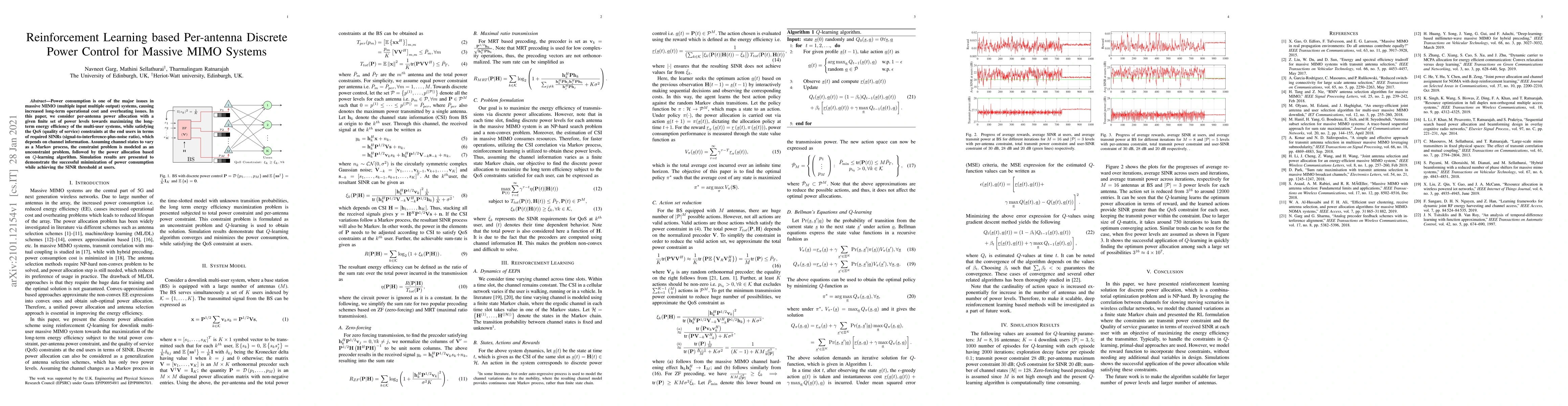 This paper proposes a reinforcement learning-based approach using Q-learning for per-antenna discrete power control in massive MIMO systems to maximize energy efficiency while meeting user QoS requirements. Simulation results show effective power consumption reduction while maintaining required SINR levels.
