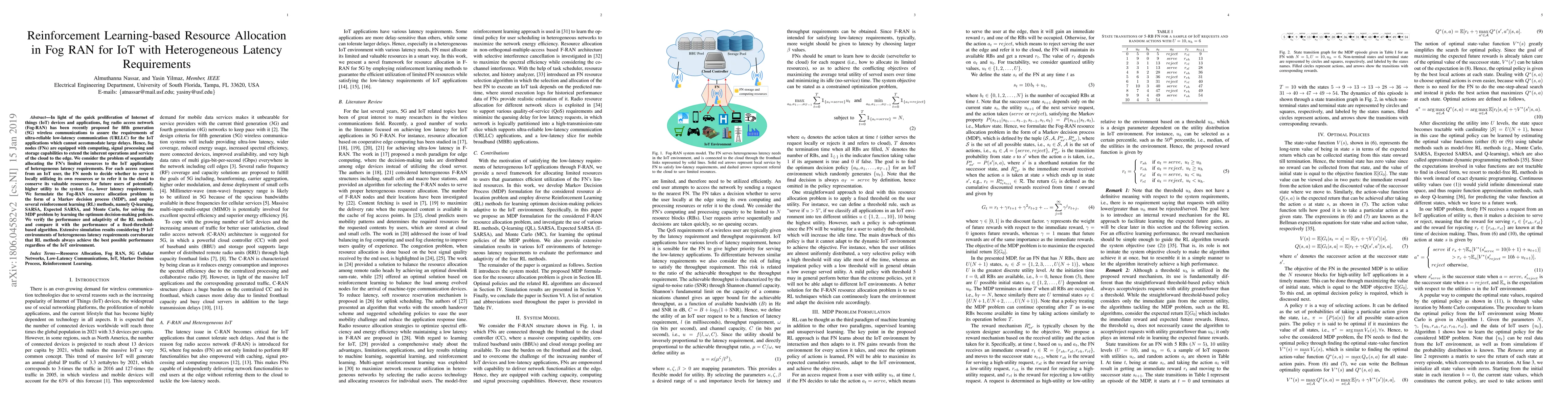 In light of the quick proliferation of Internet of things (IoT) devices and applications, fog radio access network (Fog-RAN) has been recently proposed for fifth generation (5G) wireless communications to assure the requirements of ultra-reliable low-latency communication (URLLC) for the IoT applications which cannot accommodate large delays. Hence, fog nodes (FNs) are equipped with computing, signal processing and storage capabilities to extend the inherent operations and services of the cloud to the edge. We consider the problem of sequentially allocating the FN's limited resources to the IoT applications of heterogeneous latency requirements. For each access request from an IoT user, the FN needs to decide whether to serve it locally utilizing its own resources or to refer it to the cloud to conserve its valuable resources for future users of potentially higher utility to the system (i.e., lower latency requirement). We formulate the Fog-RAN resource allocation problem in the form of a Markov decision process (MDP), and employ several reinforcement learning (RL) methods, namely Q-learning, SARSA, Expected SARSA, and Monte Carlo, for solving the MDP problem by learning the optimum decision-making policies. We verify the performance and adaptivity of the RL methods and compare it with the performance of a fixed-threshold-based algorithm. Extensive simulation results considering 19 IoT environments of heterogeneous latency requirements corroborate that RL methods always achieve the best possible performance regardless of the IoT environment.