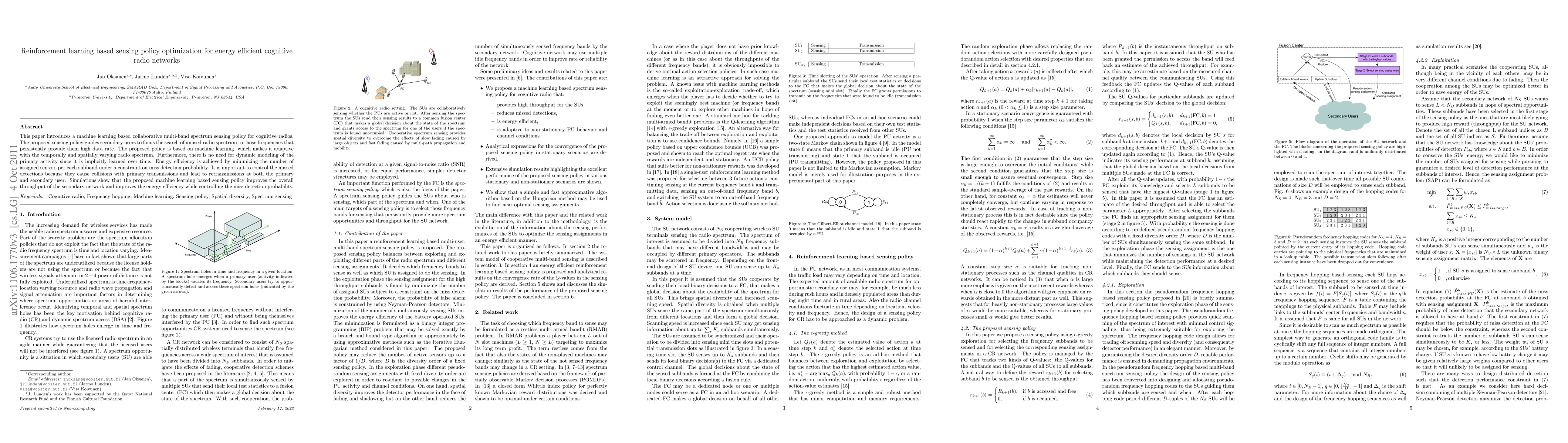 A machine learning-based sensing policy optimizes energy-efficient cognitive radio networks by guiding secondary users to focus on unused frequencies with high data rates. The policy improves overall throughput and energy efficiency while controlling miss detection probability.