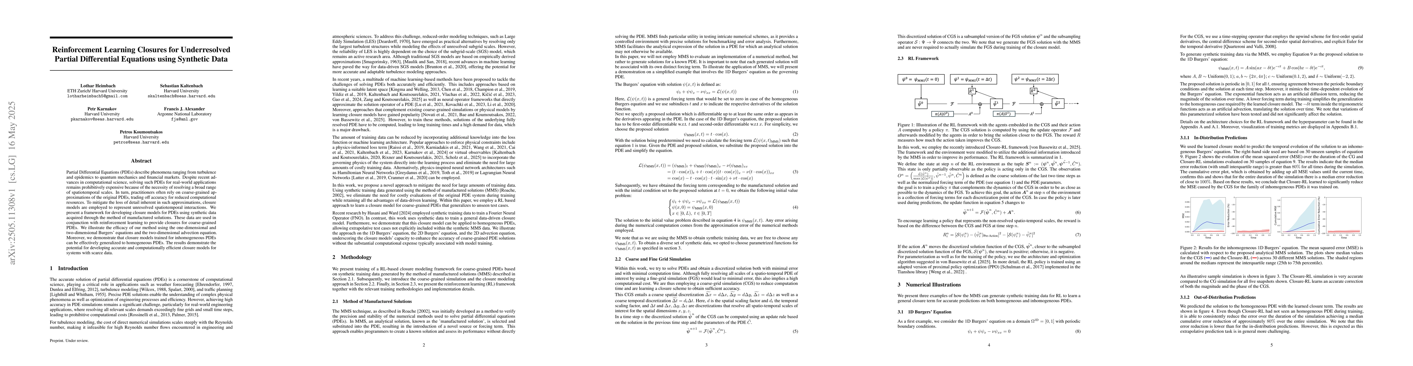This research introduces a method using reinforcement learning and synthetic data to create closure models for underresolved Partial Differential Equations (PDEs), enhancing computational efficiency without significant accuracy loss. The approach is validated with Burgers' equations and the advection equation, showing potential for systems with limited data.