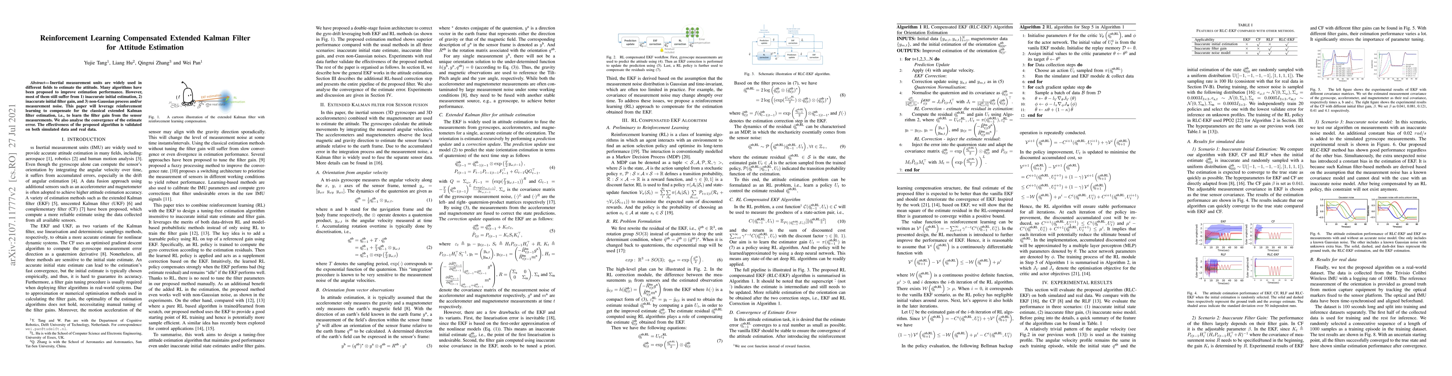 Inertial measurement units are widely used in different fields to estimate the attitude. Many algorithms have been proposed to improve estimation performance. However, most of them still suffer from 1) inaccurate initial estimation, 2) inaccurate initial filter gain, and 3) non-Gaussian process and/or measurement noise. In this paper, we leverage reinforcement learning to compensate for the classical extended Kalman filter estimation, i.e., to learn the filter gain from the sensor measurements. We also analyse the convergence of the estimate error. The effectiveness of the proposed algorithm is validated on both simulated data and real data.