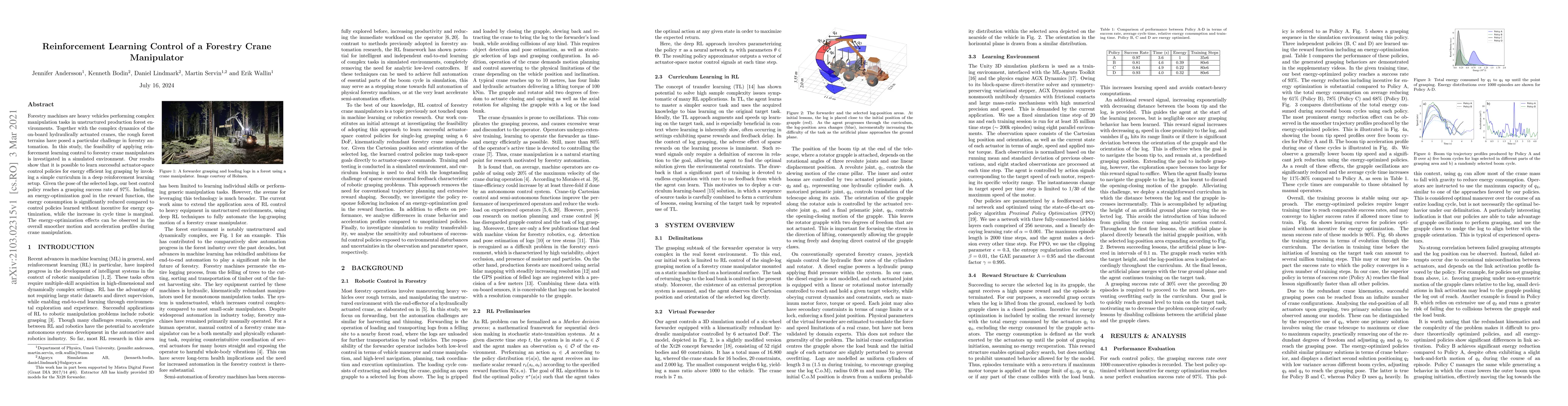 This study investigates reinforcement learning control for a forestry crane manipulator in a simulated environment, demonstrating successful actuator-space control policies for energy-efficient log grasping with a 97% success rate. The inclusion of an energy-optimization goal in the reward function significantly reduces energy consumption with only a marginal increase in cycle time.